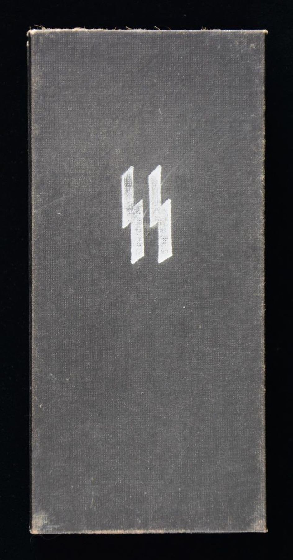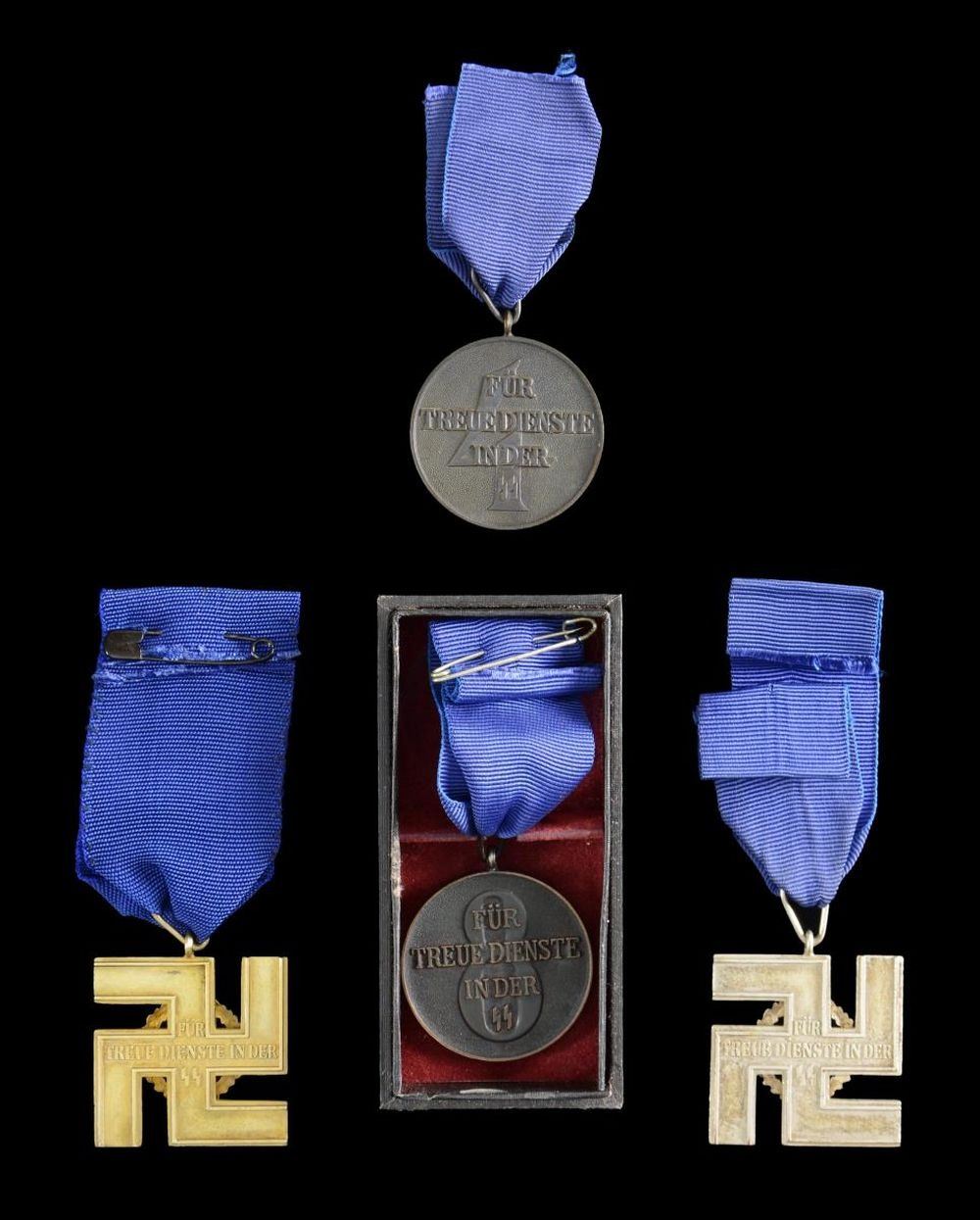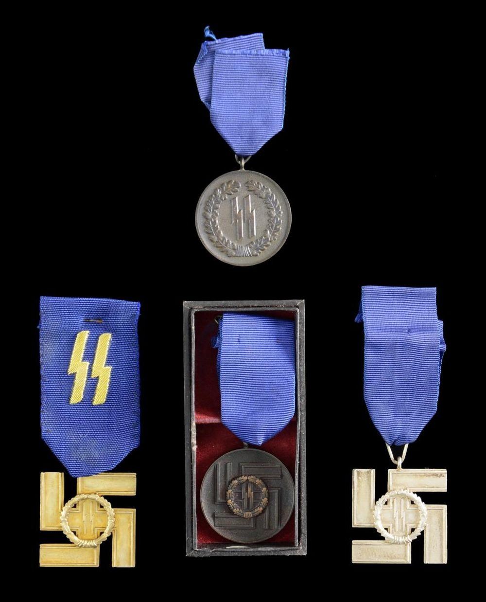 This lot contains items of questionable authenticity that may be of post-WWII manufacture. We encourage interested parties to examine items in this lot closely and in person, if possible. Preview times are available upon request. 1) 12 YEAR. This WWII German 12 Year SS Long Service Medal depicts a large silver party symbol with a central wreath encircling SS runes. The reverse reads "FUR TREUE DIENSTE IN DER SS". Plain cornflower blue ribbon measuring 1 1/8" in width. (02-22550/BF). 2) 25 YEAR. This WWII German 25 Year SS Long Service Medal depicts a large gilded party symbol with a central wreath encircling SS runes. The reverse reads "FUR TREUE DIENSTE IN DER SS". Cornflower blue ribbon measuring 1 1/2" in width with 1 1/8" tall gold bullion SS runes embroidered on the face. (02-22551/BF). 3) 8 YEAR. This WWII German 8 Year SS Long Service Medal is a bronze disc that depicts a party symbol with a central wreath encircling SS runes on the face. The reverse reads "FUR TREUE DIENSTE IN DER SS" superimposed over a large "8". Plain cornflower blue ribbon measuring 1 1/8" in width. This medal is housed in a black presentation box with a burgundy interior and embossed silver SS runes on the cover. (02-22552/BF) 4) 4 YEAR. This WWII German 4 Year SS Long Service Medal is a bronze disc that depicts a party symbol with a central wreath encircling SS runes on the face. The reverse reads "FUR TREUE DIENSTE IN DER SS" superimposed over a large "4". Plain cornflower blue ribbon measuring 1 1/8" in width. (02-22553/BF). CONDITION: all four medals generally show light wear. The presentation box shows moderate wear with a loss of the black covering at the top of the lid. NON-GUN. $100-300.