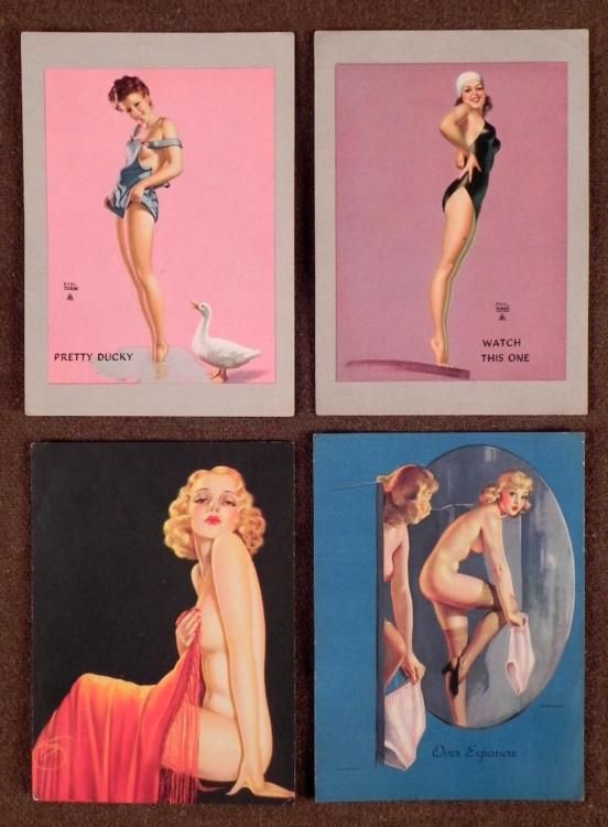 4 WWII VINTAGE EARL MORAN PRINTS-1 VARGAS PRINT-1 LUGREN--5X7""-WWII""NAUGHTY ""CHEESECAKE"" VARGAS DRAPED NUDE--""WATCH THIS ONE""--""OVER""EXPOSURE"" ""PRETTY DUCKY"" BY EARL MORAN &LUGREN"