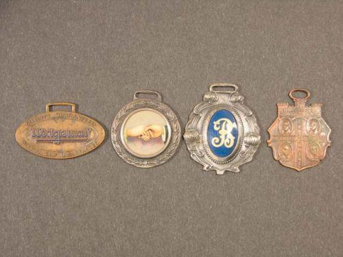 4 watch fobs. 1) Martin & Martin glad hand soap - Chicago. 2) Morley-Murphy Hardware Co. Green Bay WI. 3) Sioux City Iron Co., Sioux City, IA. 4) Pittsburgh Centennial 1909 Disciples of Christ.