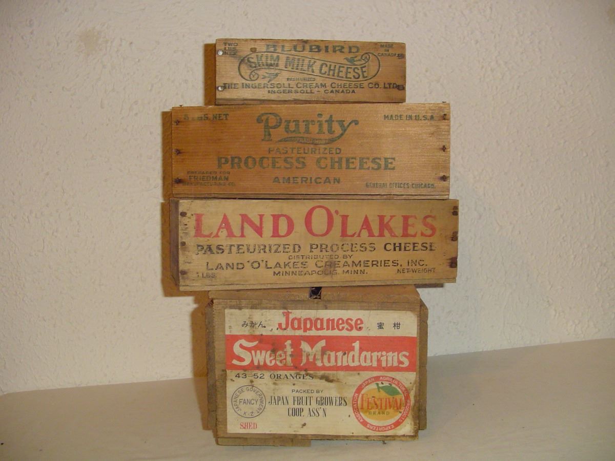 4 Wooden Advertising Cheese And Orange Boxes