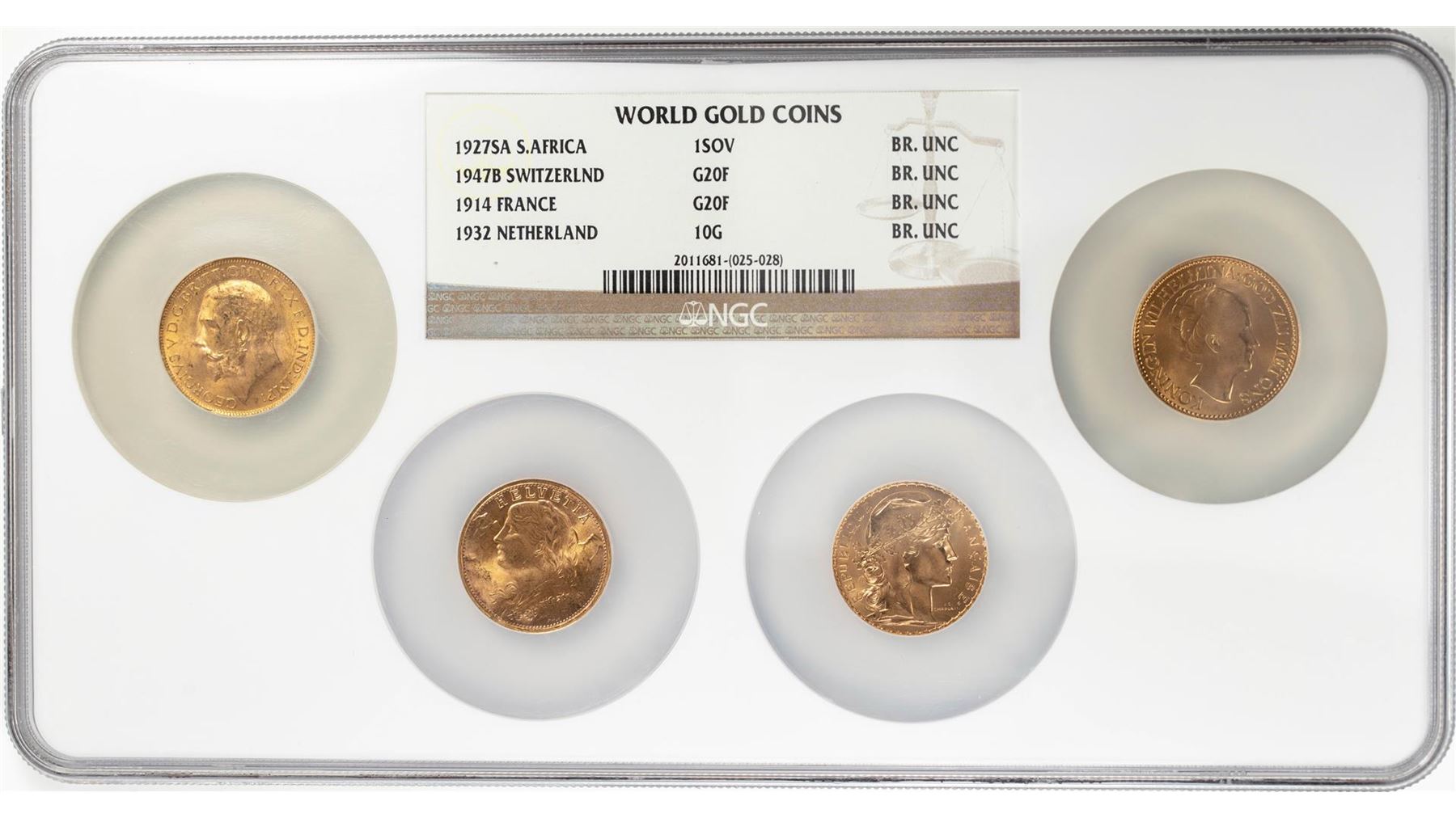One Lot of (4) World Gold Coins '27 South Africa '47 Swiss '14 France '32 Netherland NGC Uncirculated. NGC Certified.