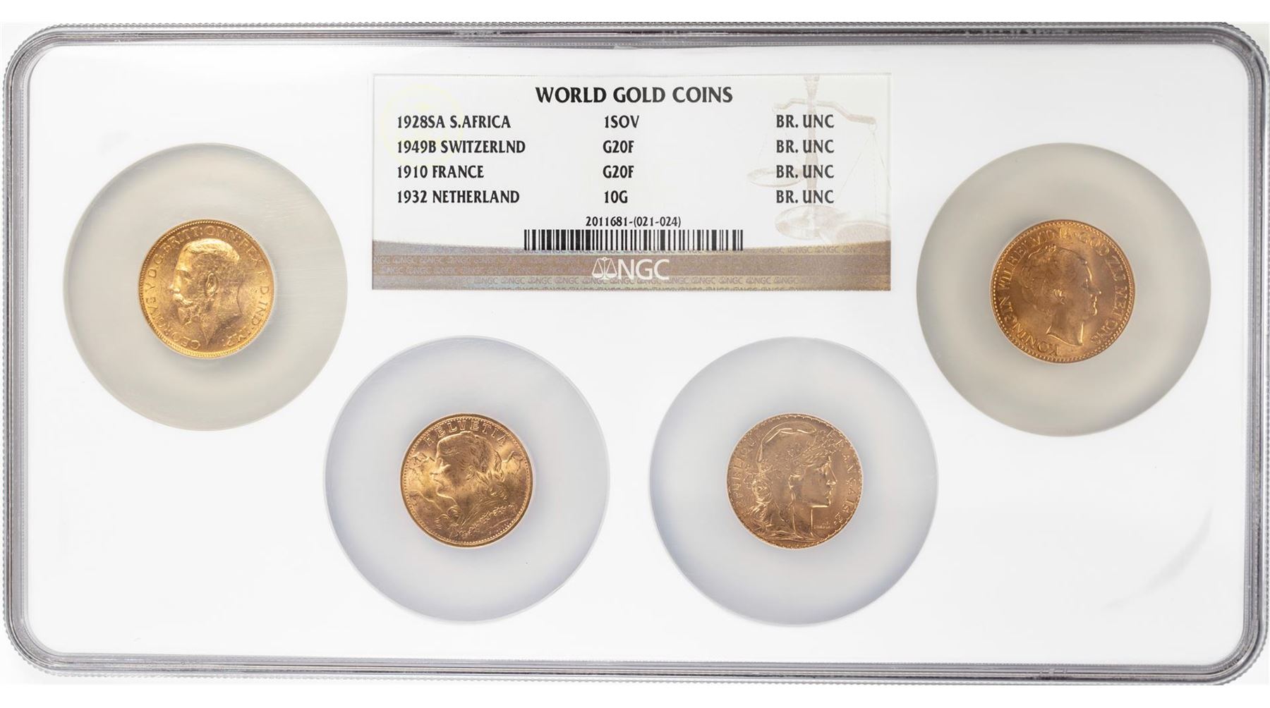 One Lot of (4) World Gold Coins '28 South Africa '49 Swiss '10 France '32 Netherland NGC Uncirculated. NGC Certified.