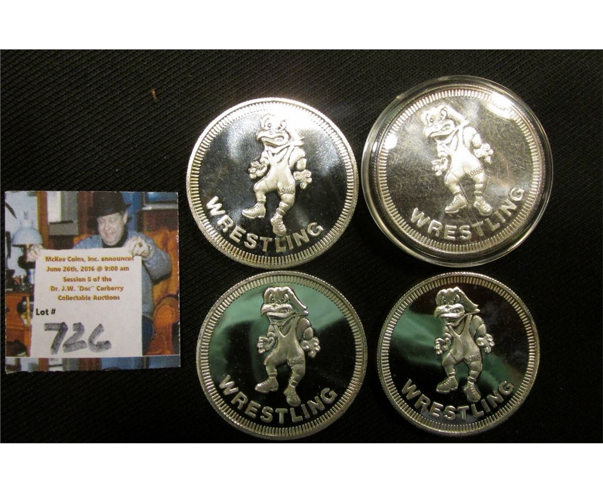 (4) "Wrestling" depicts Herkey Hawk, "The University of Iowa/Hawkeyes/One Troy Ounce .999 Fine Silver" Medallions.