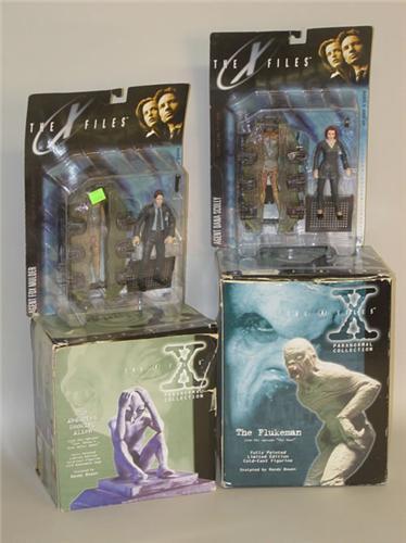 (4) X-FILE TOYS: (2) COLD CAST FIGURINES-(1) FLUKEMAN & (1) SMOKING ALIEN & (2) ACTION FIGURES-(1) MULDER & (1) SCULLY - TOYS BY MCFARLANE TOYS & BOWEN DESIGNS W/ ORIGINAL PACKAGING