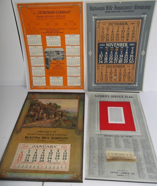 4 advertising calendars including 1919 Goshen's Service Flag; 1929 Electra Mfg. Company; 1924 J.R. Watkins Company; 1929 National Life Insurance Company. Some foxing; creases. Largest measures 21 inches x 14