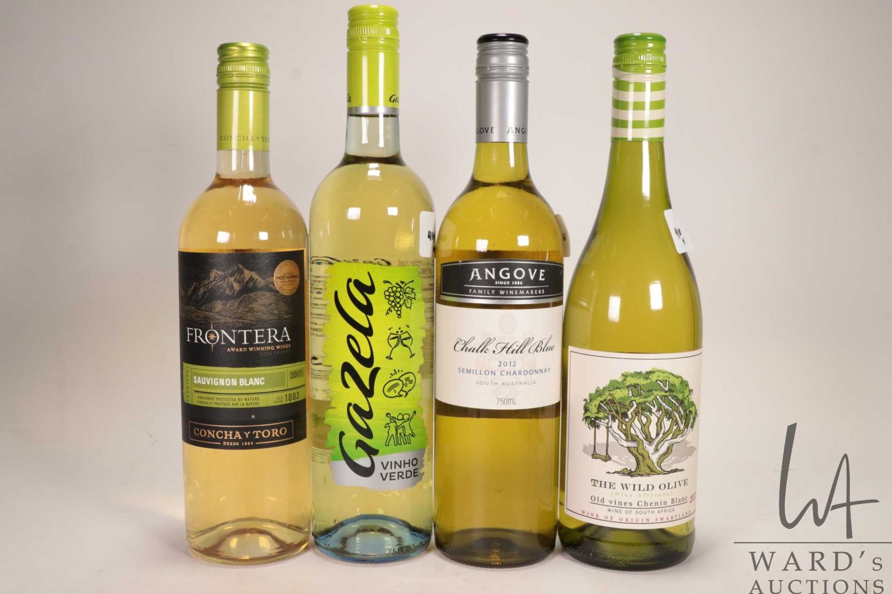 4 bottles of wine inclduing a bottle of Conchay Toro / Frontera / Sauvignon Blanc / 750ml / 12.5% ABV, a bottle of Gazela / Vinho Verde / 750ml / 9% ABV, a bottle of Angove / Chalk Hill Blue / Semillon Chardonnay / 750ml / 13.5% ABV, and a bottle of The Wild Olive / Old vines Chenin Blanc / 750ml / 13% ABV Note: Alcohol cannot be insured by any courier in Canada. Local pick up is recommended. Canadian bidders only
