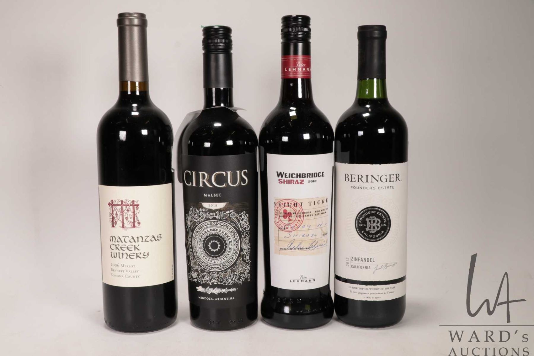 4 bottles of wine including Matanzas Creek Winery / 2006 Merlot / 14.1% ABV, a bottle of Circus / Malbec / 750ml / 13.5%, a bottle of Weighbridge / Shiraz / 750ml / 14.5%, and a bottle of Beringer / Founders Estate / Zinfandel / 750ml / 14% ABV Note: Alcohol cannot be insured by any courier in Canada. Local pick up is recommended. Canadian bidders only