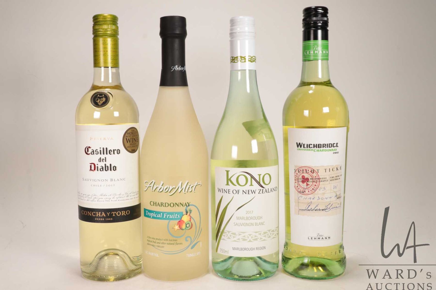 4 bottles of wine including a bottle of Casillero del Diablo / Sauvignon Blanc / 750ml / 12.5% ABV, a bottle of Arbor Mist/ Chardonnay / Tropical Fruits / 750ml / 6% ABV, a bottle of Kona / Marlborough / Sauvignon Blanc / 750ml / 13% ABV, and a bottle of Weighbridge / Unwooded Chardonnay / 750ml / 12.5% ABV Note: Alcohol cannot be insured by any courier in Canada. Local pick up is recommended. Canadian bidders only