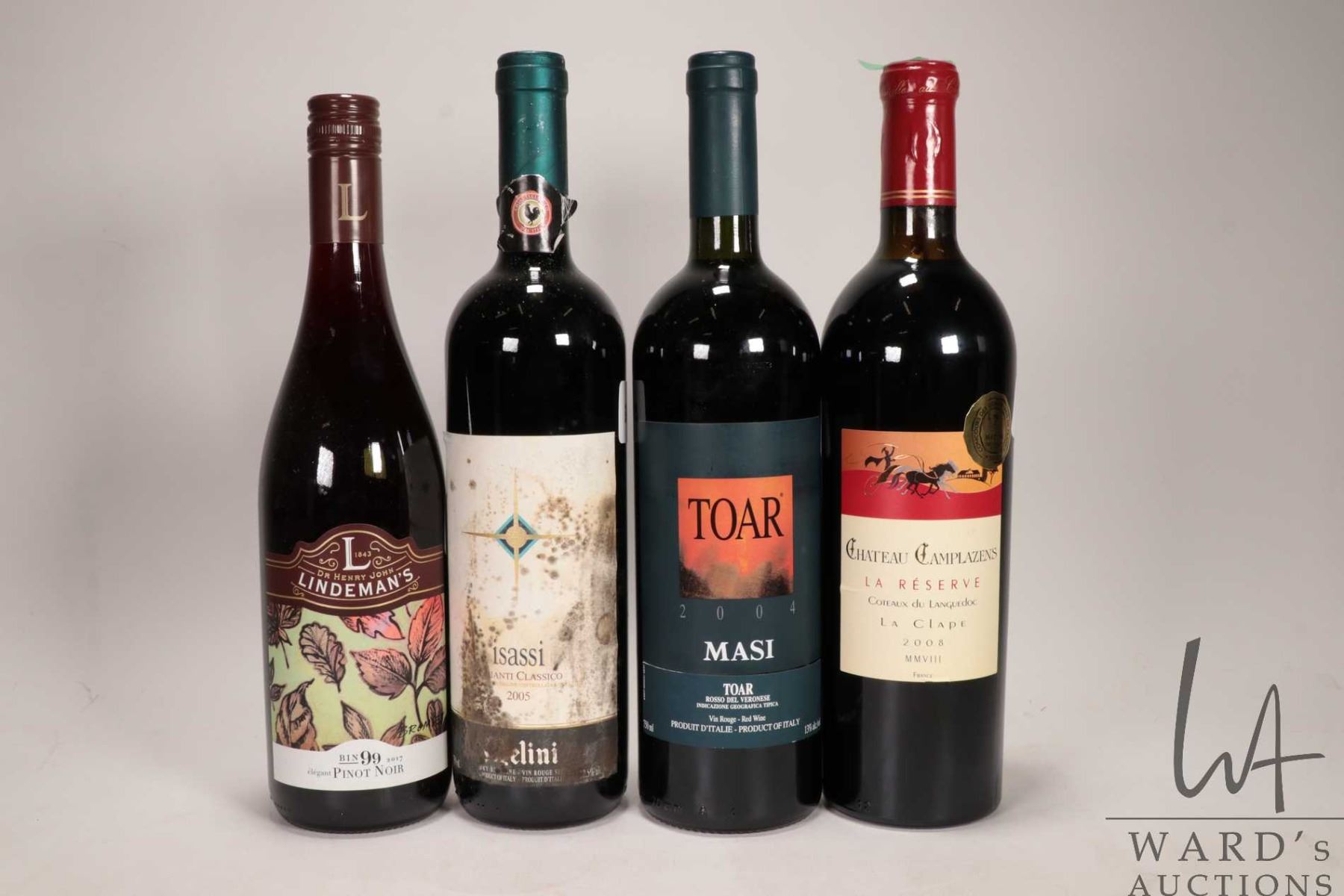 4 bottles of wine including a bottle of Lindeman's / Pinot Noir / 750ml / 13.5% ABV, a bottle of Isassi / Chianti Classico / 750ml / 12.5% ABV, a bottle of TOAR / Masi / 750ml / 13% ABV, and a bottle of Chateau Camplazens / La Clape / 750ml / 13.5% ABV Note: Alcohol cannot be insured by any courier in Canada. Local pick up is recommended. Canadian bidders only