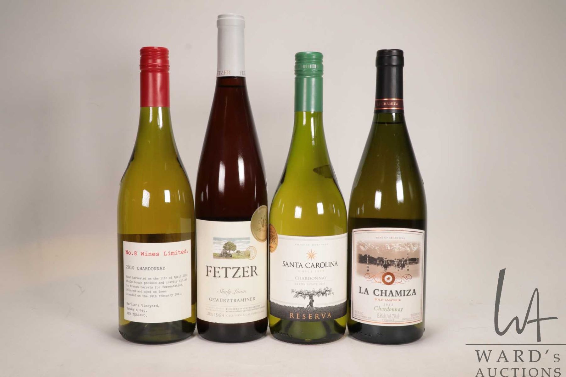 4 bottles of wine including a bottle of No.8 Wines Limited / 2010 Chardonnay / 750ml / 13.8% ABV, a bottle of Fetzer / Shaly Loam / Gewurztraminer / 750ml / 12% ABV, a bottle of Santa Carolina / Reserva / Chardonnay / 750ml / 13.5% ABV, and a bottle of La Chamiza / Polo Amateur / Chardonnay / 750ml / 13.5% ABV Note: Alcohol cannot be insured by any courier in Canada. Local pick up is recommended. Canadian bidders only