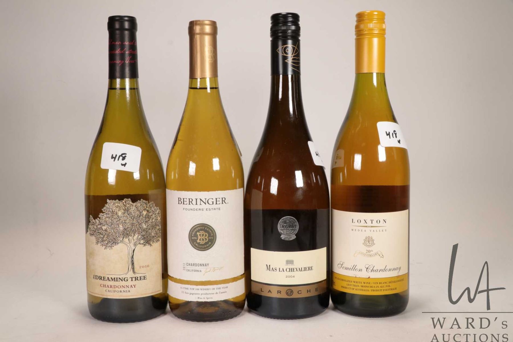 4 bottles of wine including a bottle of The Dreaming Tree / Chardonnay / 13.5% ABV, a bottle of Beringer / Chardonnay / 750ml / 14% ABV, a bottle of Laroche / Mas La Chevaliere / 750ml / 14% ABV. and a bottle of Loxton / Semillon Chardonnay / 750ml / Less than 0.5% ABV Note: Alcohol cannot be insured by any courier in Canada. Local pick up is recommended. Canadian bidders only