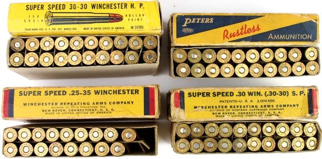 Velocity full correct, Red and Yellow Winchester Super Speed HP full correct, Black Yellow Red Winchester full mixed and Winchester 25-35 correct 17 rounds. Est. 150-250