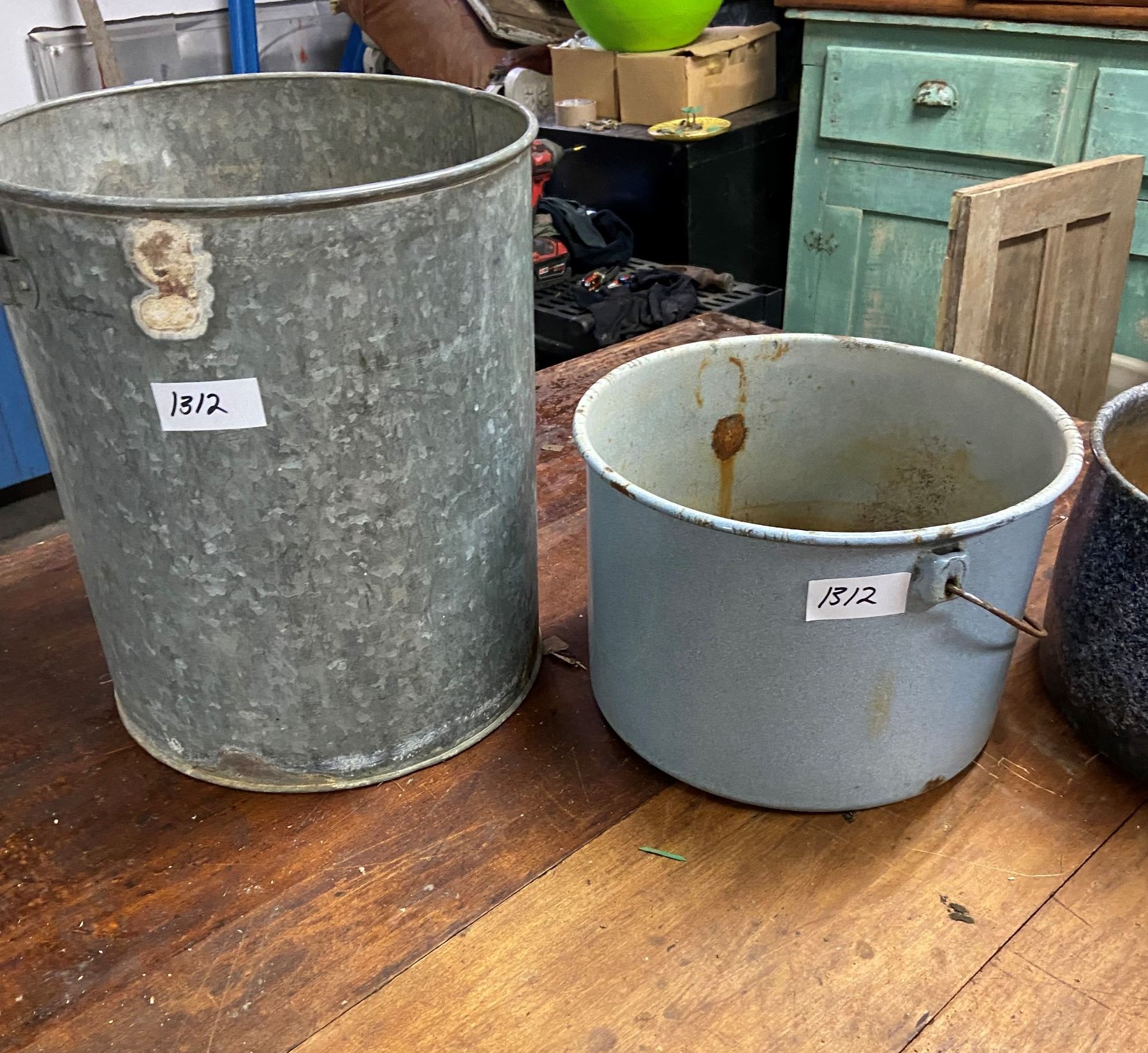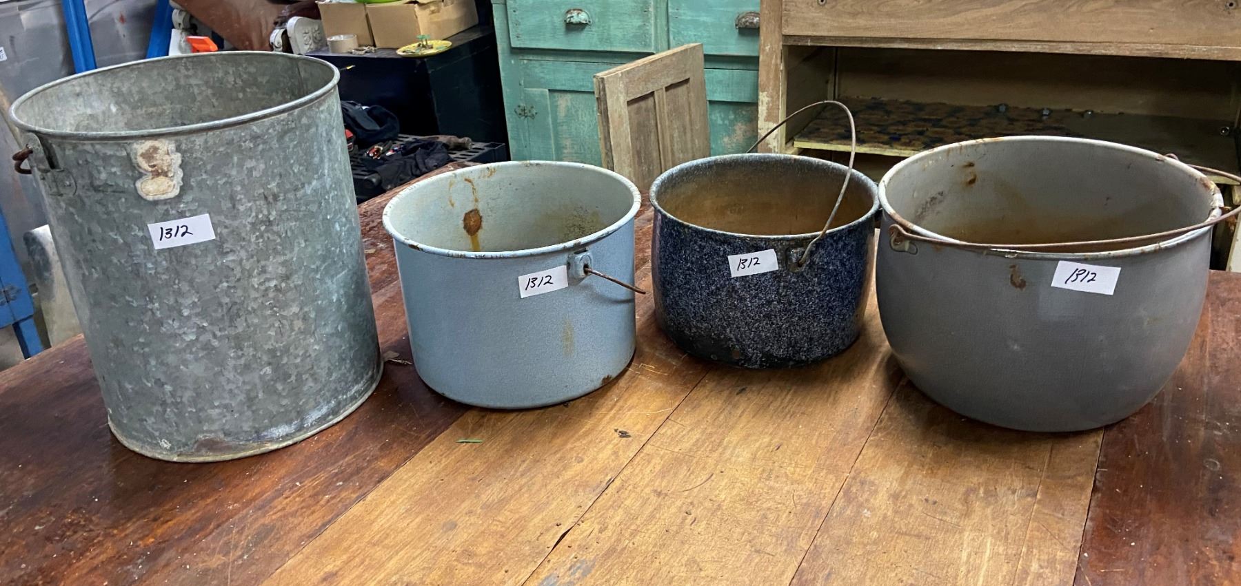 4 buckets - 3 enamelware and 1 galvanized