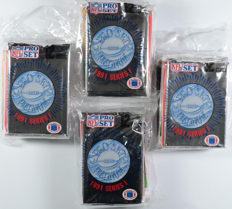 4 Sets with 5 Packs in each. 20 unopened packs total. NFL PRO SET PLATINUM 1991 SERIES 1, 1990 SERIES 2 SCORE NFL FOOTBALL CARDS, THE OFFICIAL NFL CARD PRO SET, FLEER PREMIERE EDITION 1990 PLAYER PHOTO CARDS, TOPPS STADIUM CLUB 1992 SERIES 1 SUPER PREM