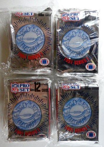 4 Sets with 5 Packs in each. 20 unopened packs total. NFL PRO SET PLATINUM 1991 SERIES 1, 1990 SERIES 2 SCORE NFL FOOTBALL CARDS, THE OFFICIAL NFL CARD PRO SET, FLEER PREMIERE EDITION 1990 PLAYER PHOTO CARDS, TOPPS STADIUM CLUB 1992 SERIES 1 SUPER PREMIUM. Est. Value $20.00.