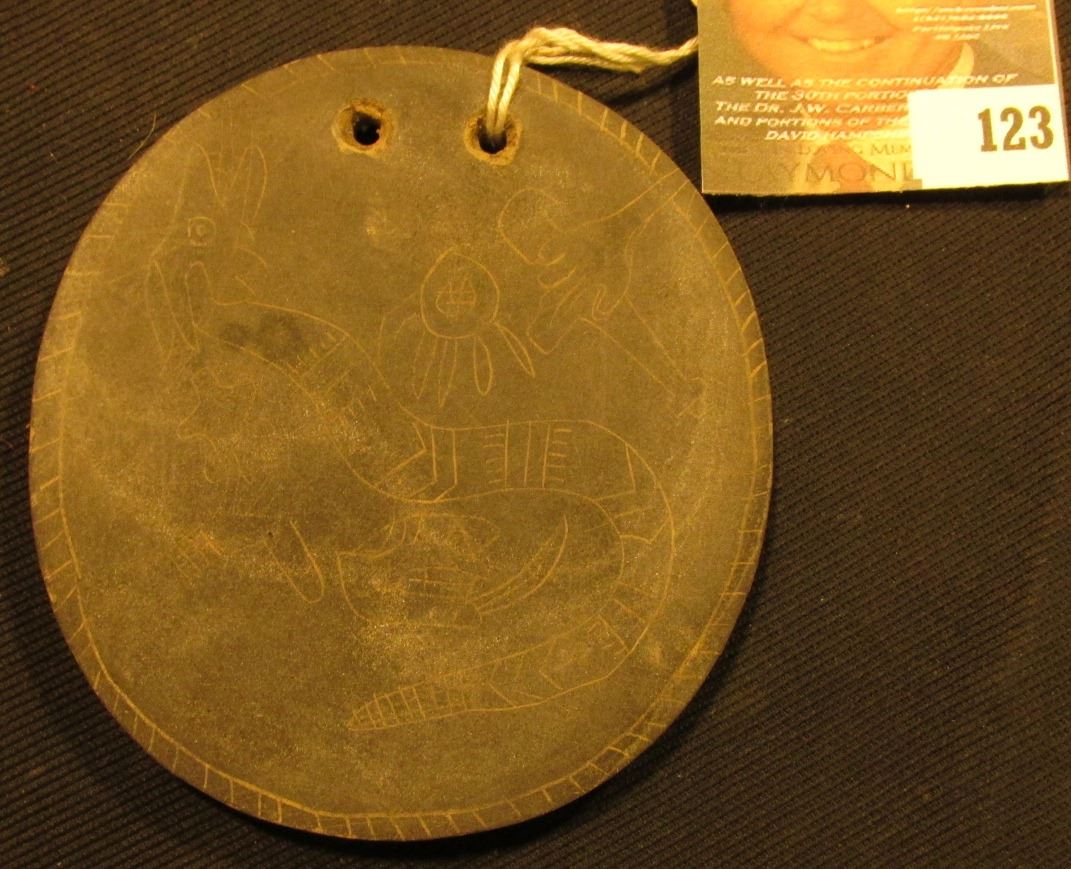 4" circular Carved Slate, which 'Doc' attributed to Northern Alabama. two holes for suspension, depi