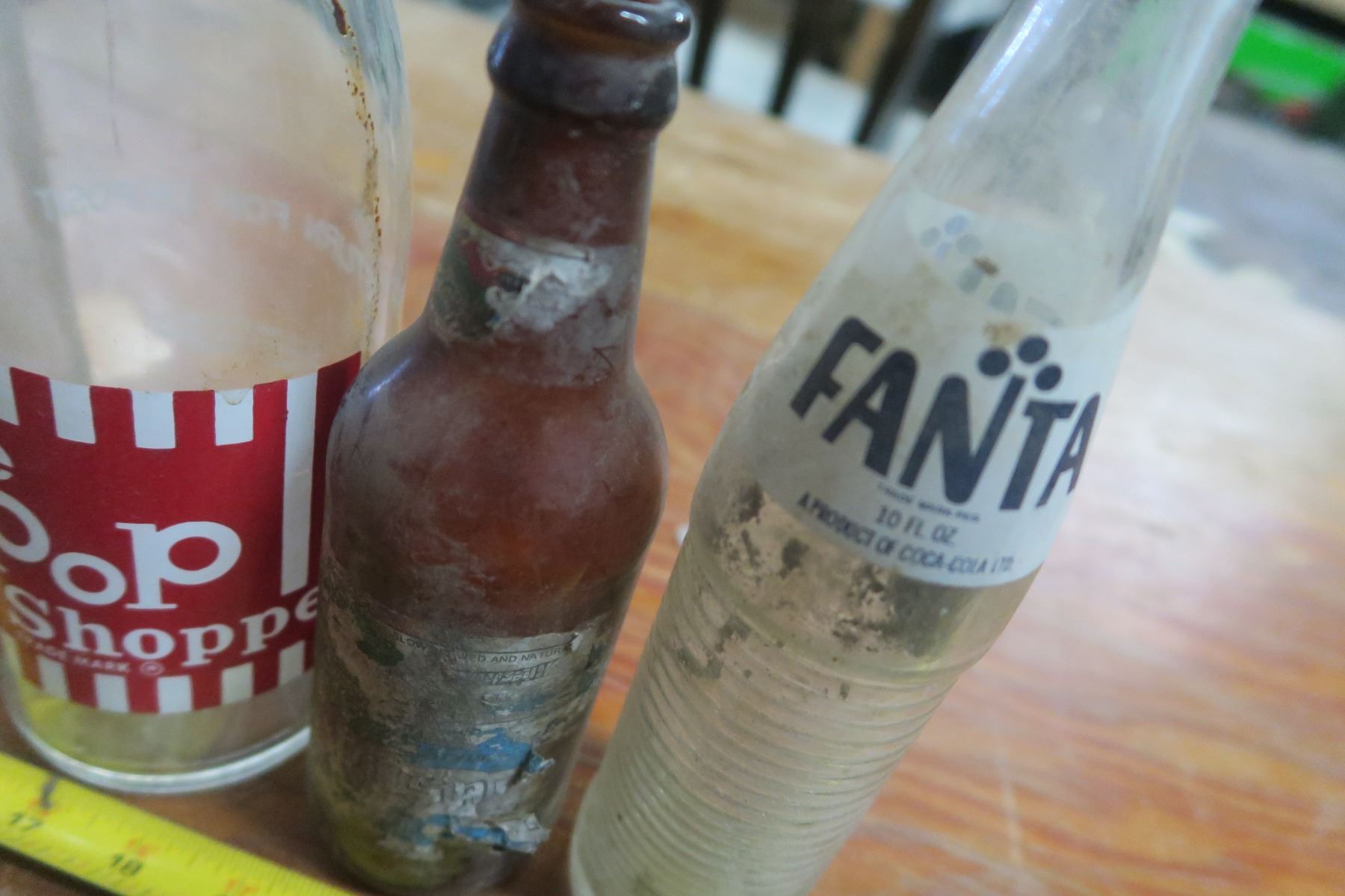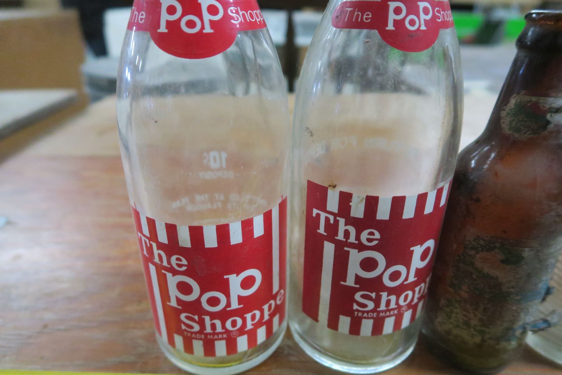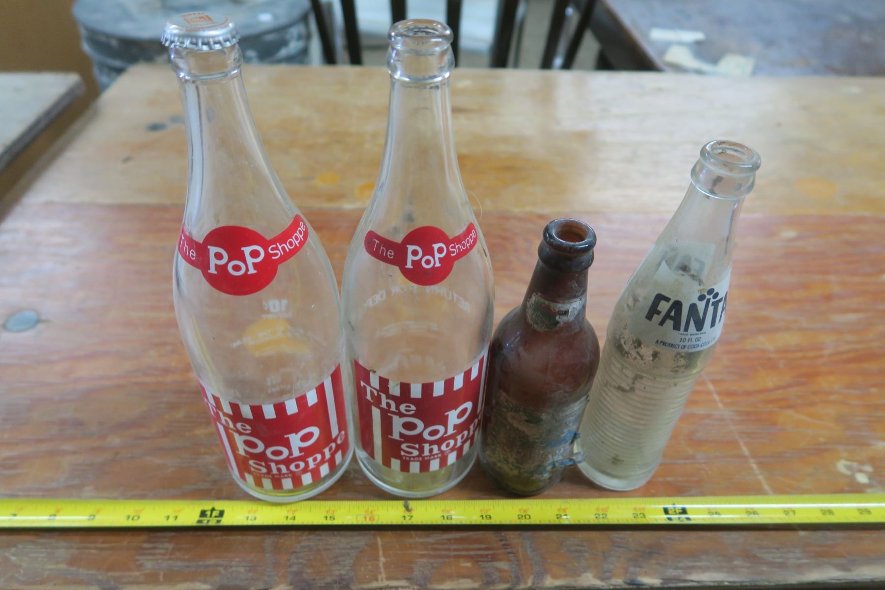 4 collectible bottles - pop shoppe, fanta and pilsner