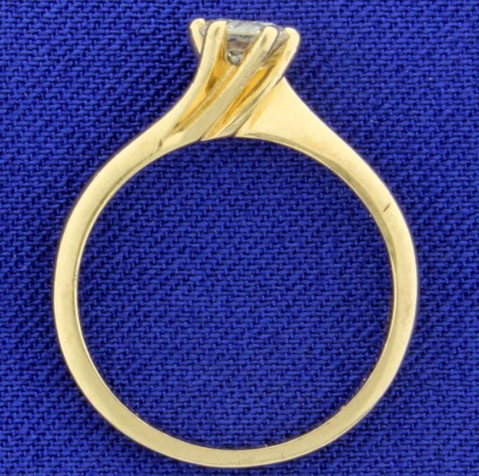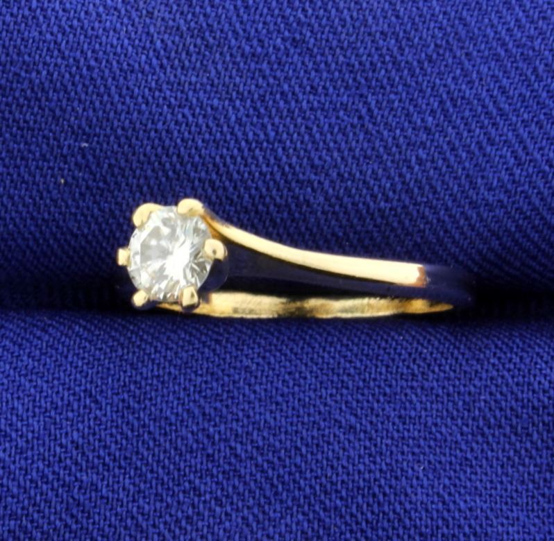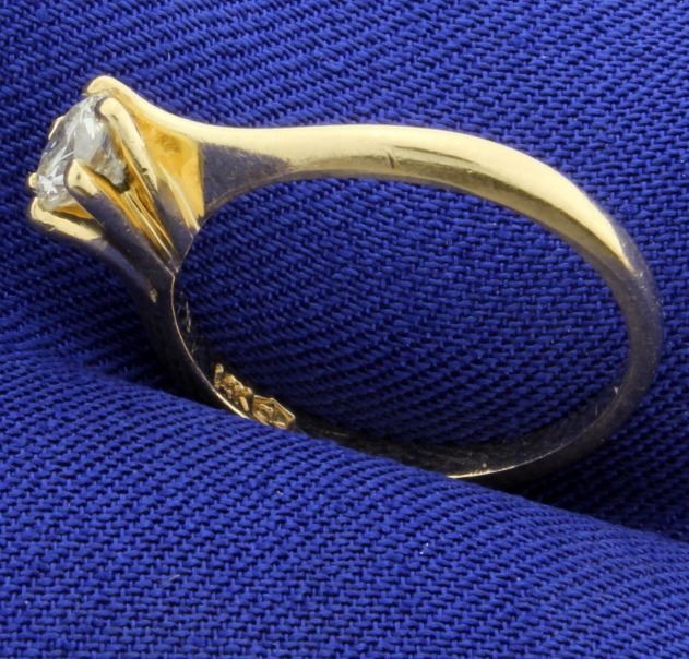 In 14K yellow gold, there is a .4ct high quality round diamond - SI2 clarity/H color. Size 6 2.1g