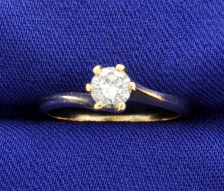 In 14K yellow gold, there is a .4ct high quality round diamond - SI2 clarity/H color. Size 6 2.1g