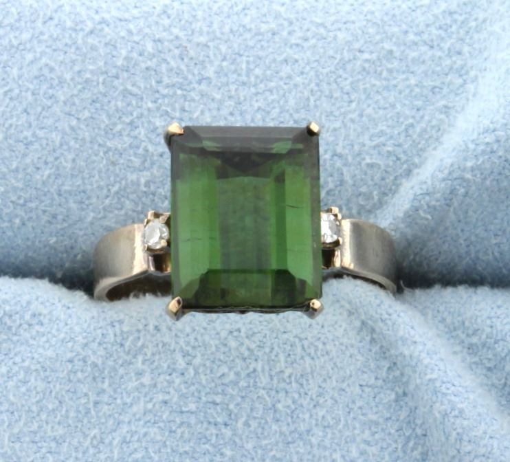 This ring is 14K yellow gold and contains two .02ct round diamonds and one 11x9mm emerald cut diopside gemstone with beautiful emerald green color and excellent clarity. Size 7 1/2 3.4g