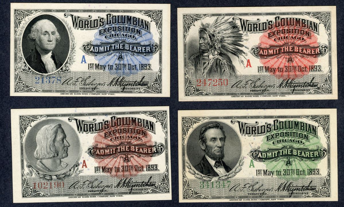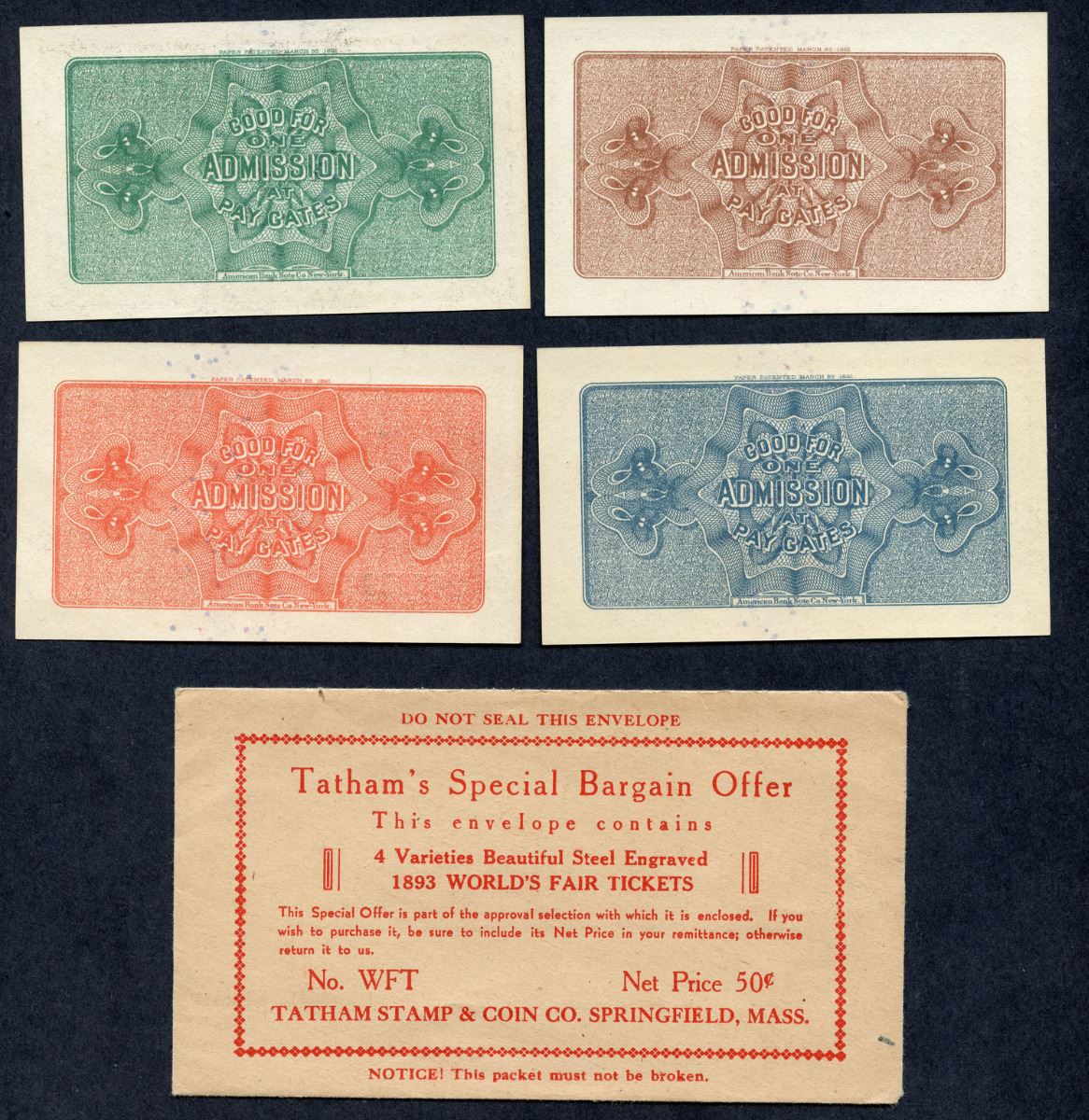 4 different 1893 World's Colombian Exposition Tickets in Tatham's mailer. All Uncirculated condition. Lot should be viewed. No returns