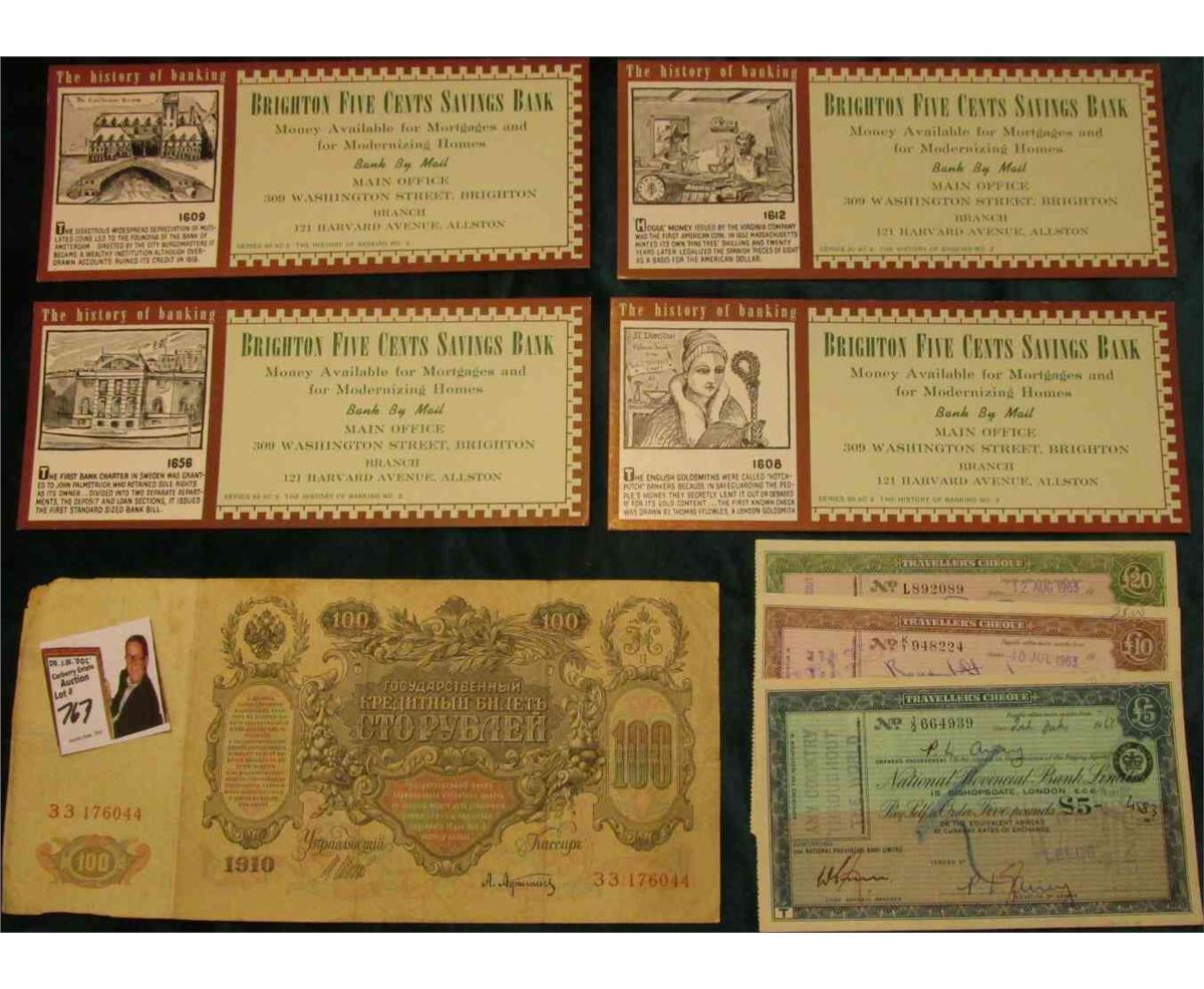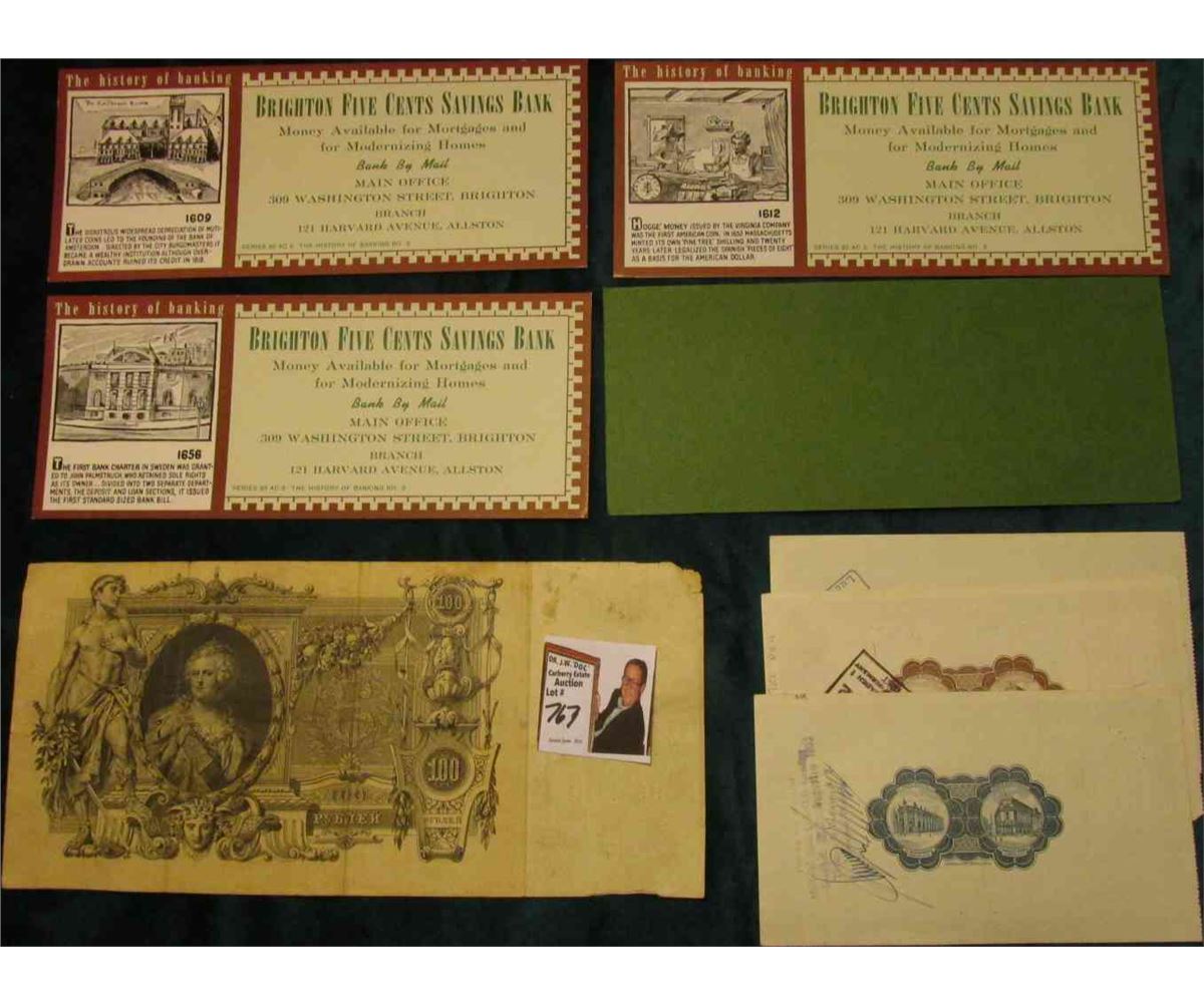 (4) different "The History of banking Brighton Five Cents Savings Bank…" Cards; (3) different National Provincial Bank, Limited Traveller's Cheques; & a Russian 100 Rouble Banknote depicting Catherine the Great.