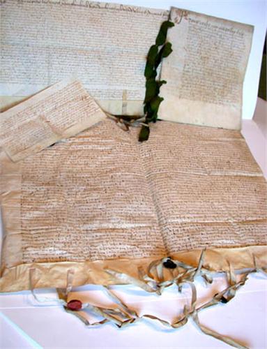 Acte au nom de Jehan Ghombault, seigneur d'Archimont, donné à Velaine, le 16 décembre 1554 (sceaux manquants).-- Acte d'une vente de terre à Edmont Goubaut, Velaine, 1581 (sceaux manquants).-- Acte passé devant le bailli de Haussy, 1615.-- Lettre exécutoire en français au nom de Thomas Sceneschault, donnée à Tournai en 1691, signée de Lannoy (sceau partiel. cons.). 550 Euros