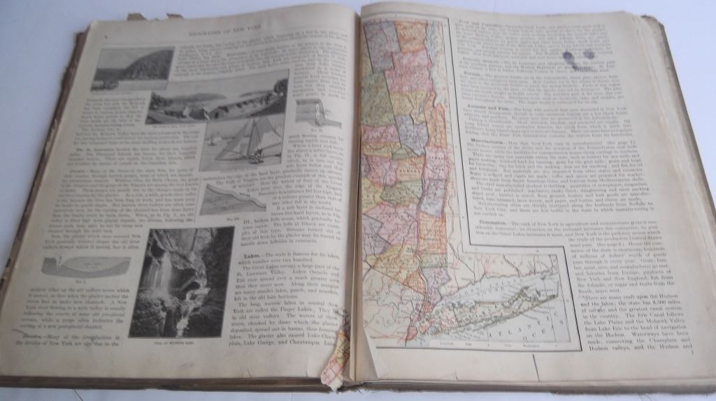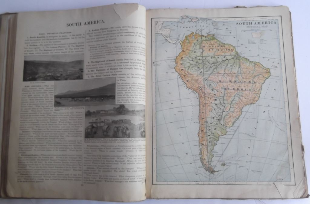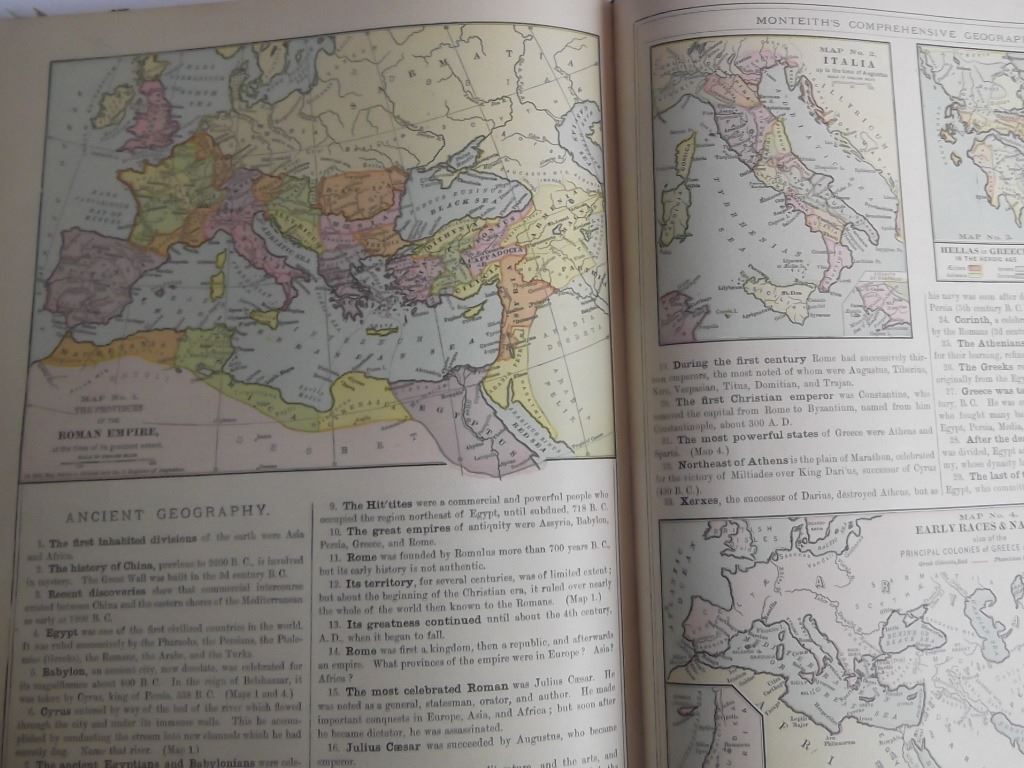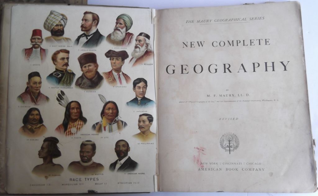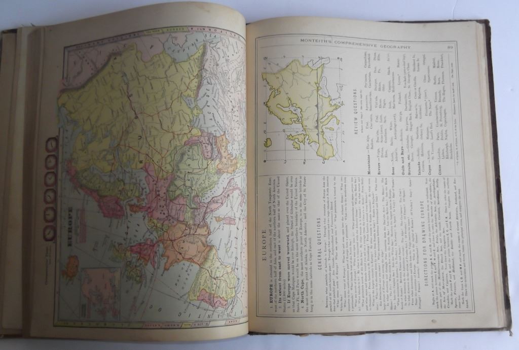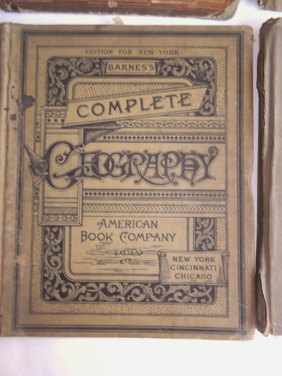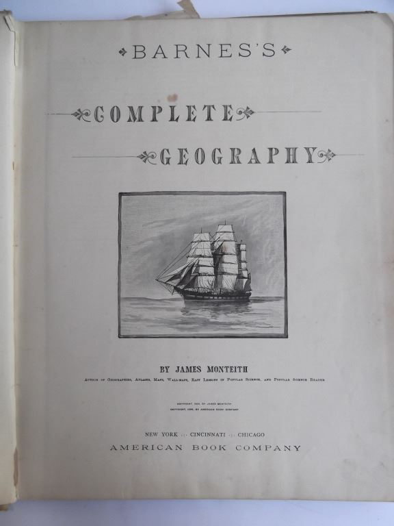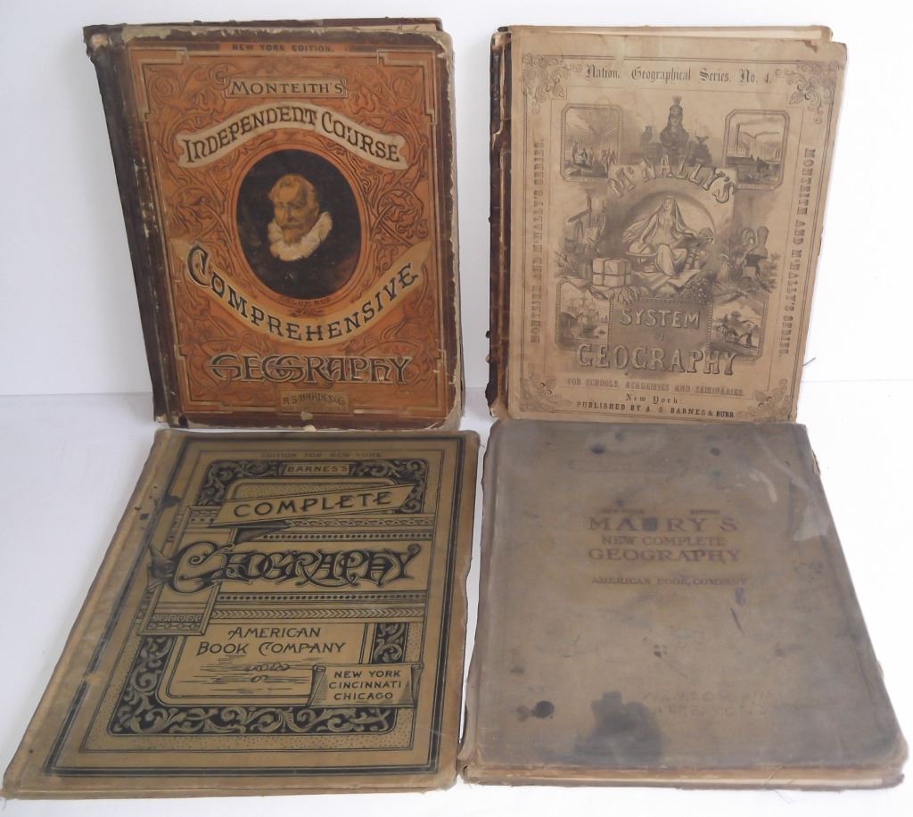 4 geography books including 1882 Monteith's Independent Course Comprehensive Geography; 1855 McNally's System of Geography; Maury's New Complete Geography; 1896 Barnes's Complete geography. Stains; foxing; tears;