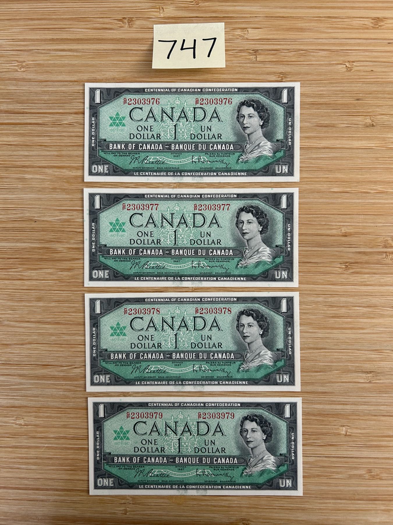 4 in sequence Canadian Centennial $1 bills excellent condition