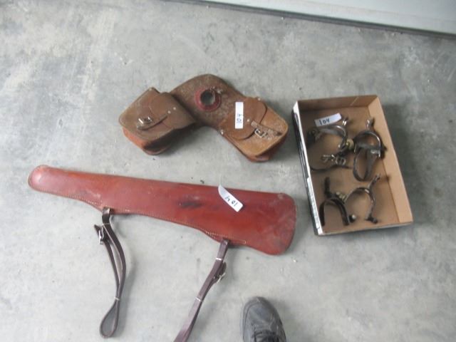 4 items - Leather Gun Case, Saddle Horn Leather Carrier, 2 Sets Spurs