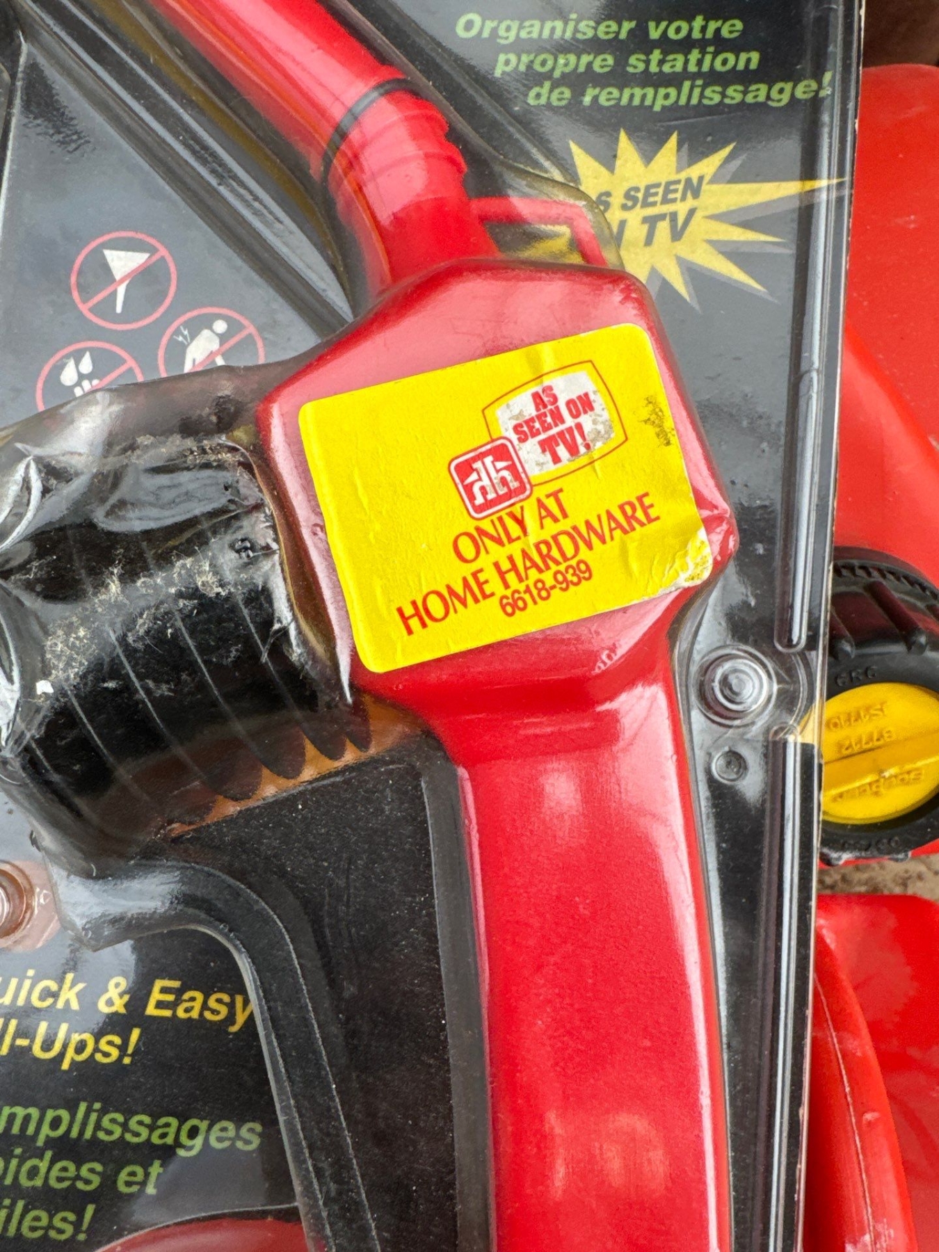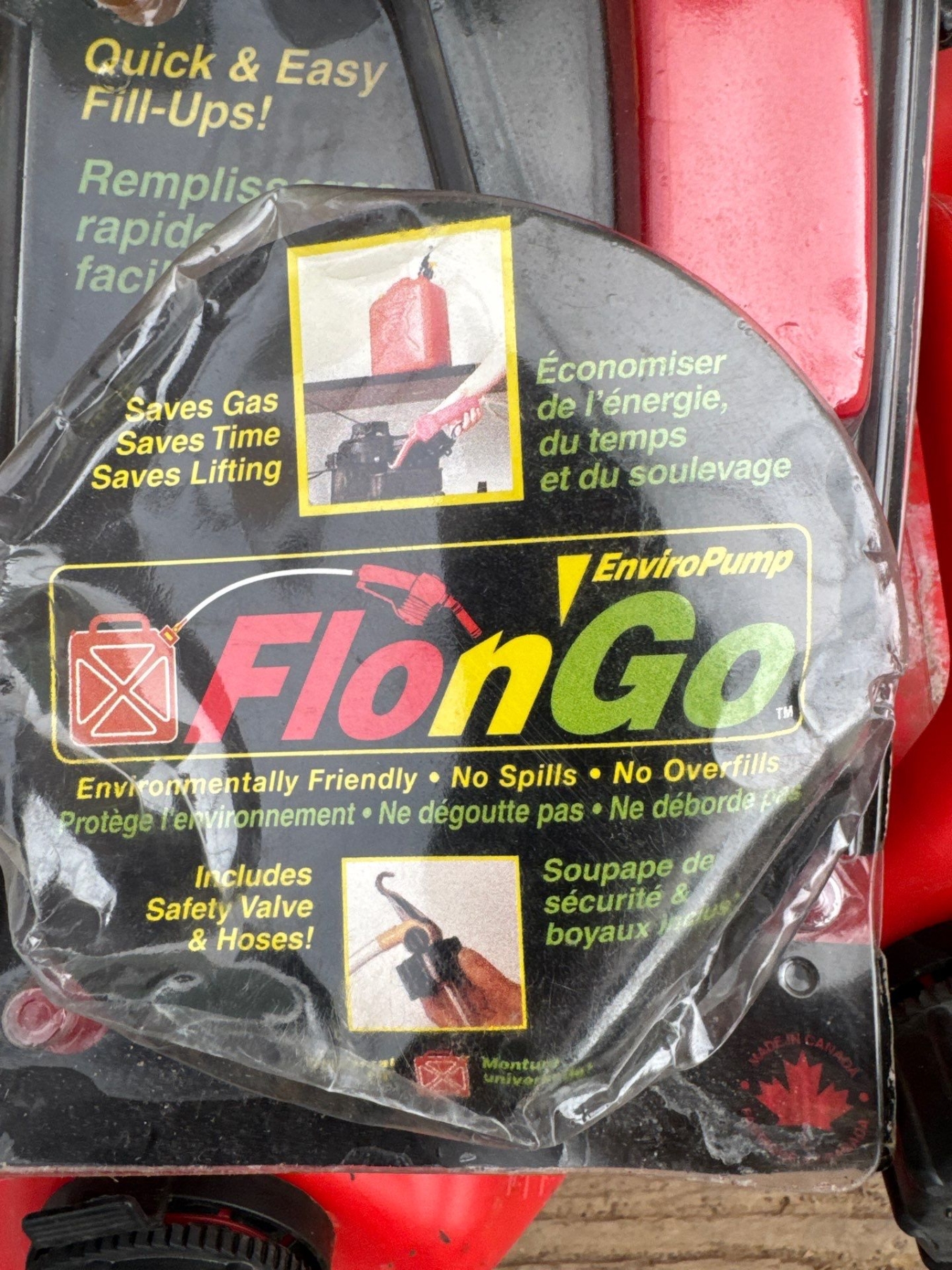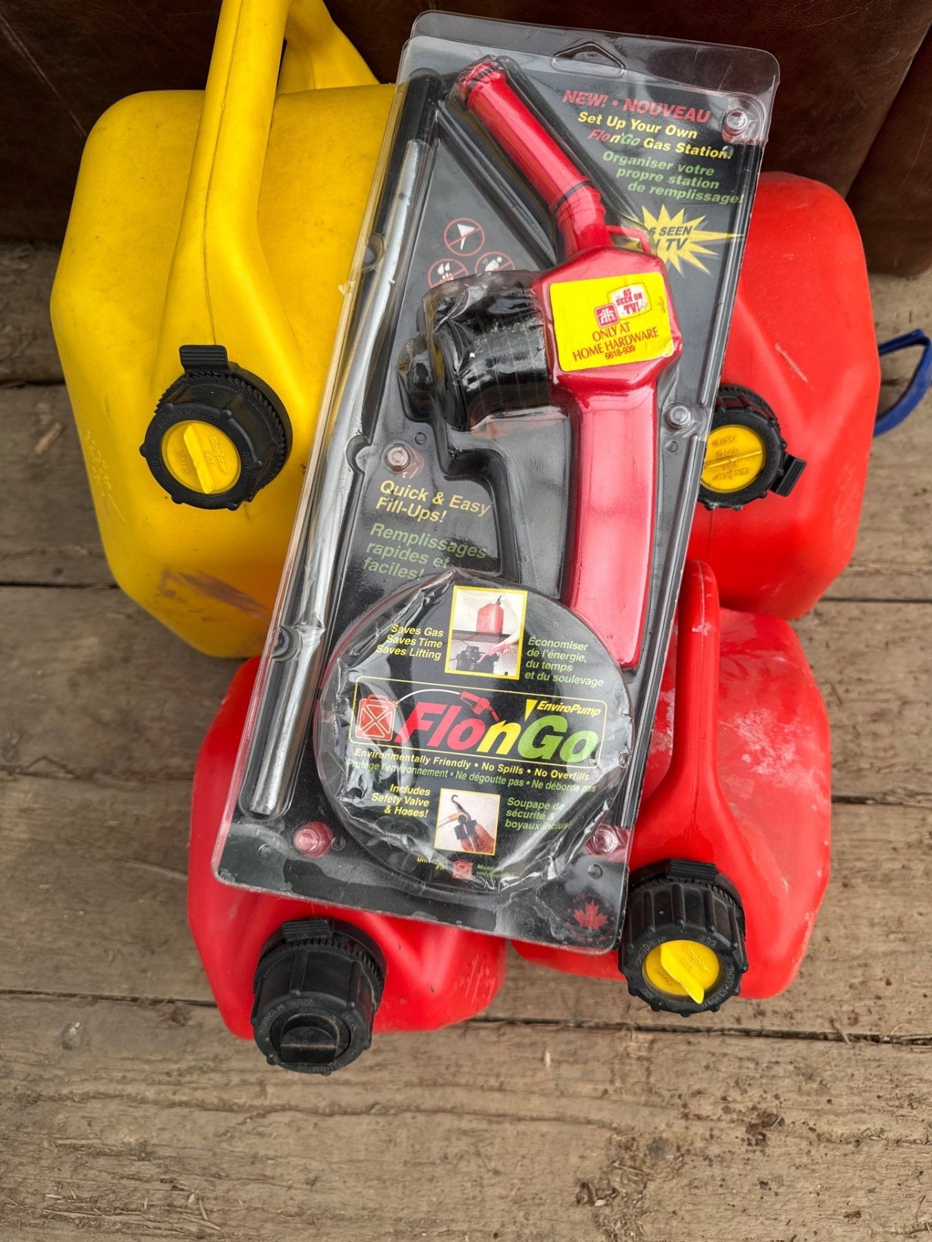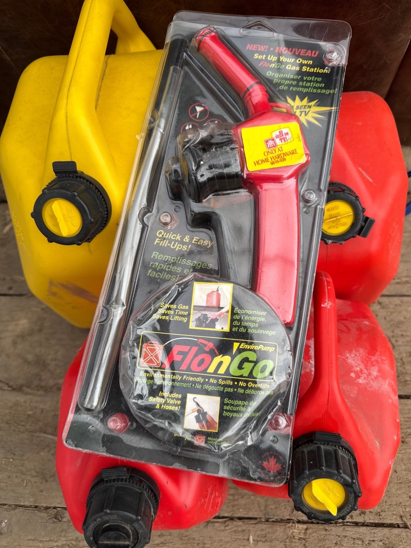 4 jerry cans, including Flow and Go Enviro pump, hand pump. It's no spill. Very nice.