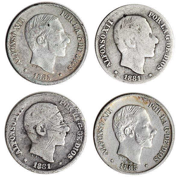 4 monedas de 10 centavos de peso: 1881 (2), 1883 Y 1885. BC/MBC+.