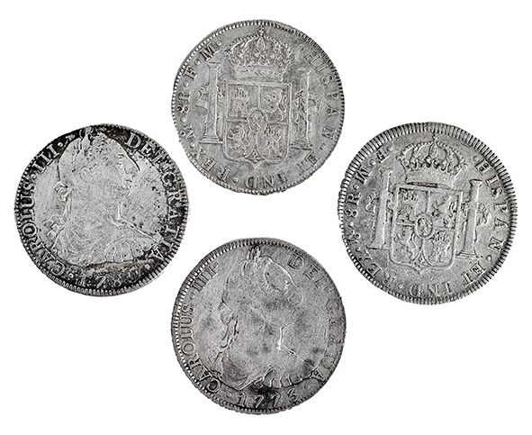 4 monedas de 8 reales: 1773, FM y FM invertidas; 1774 y 1780. BC+/MBC-.