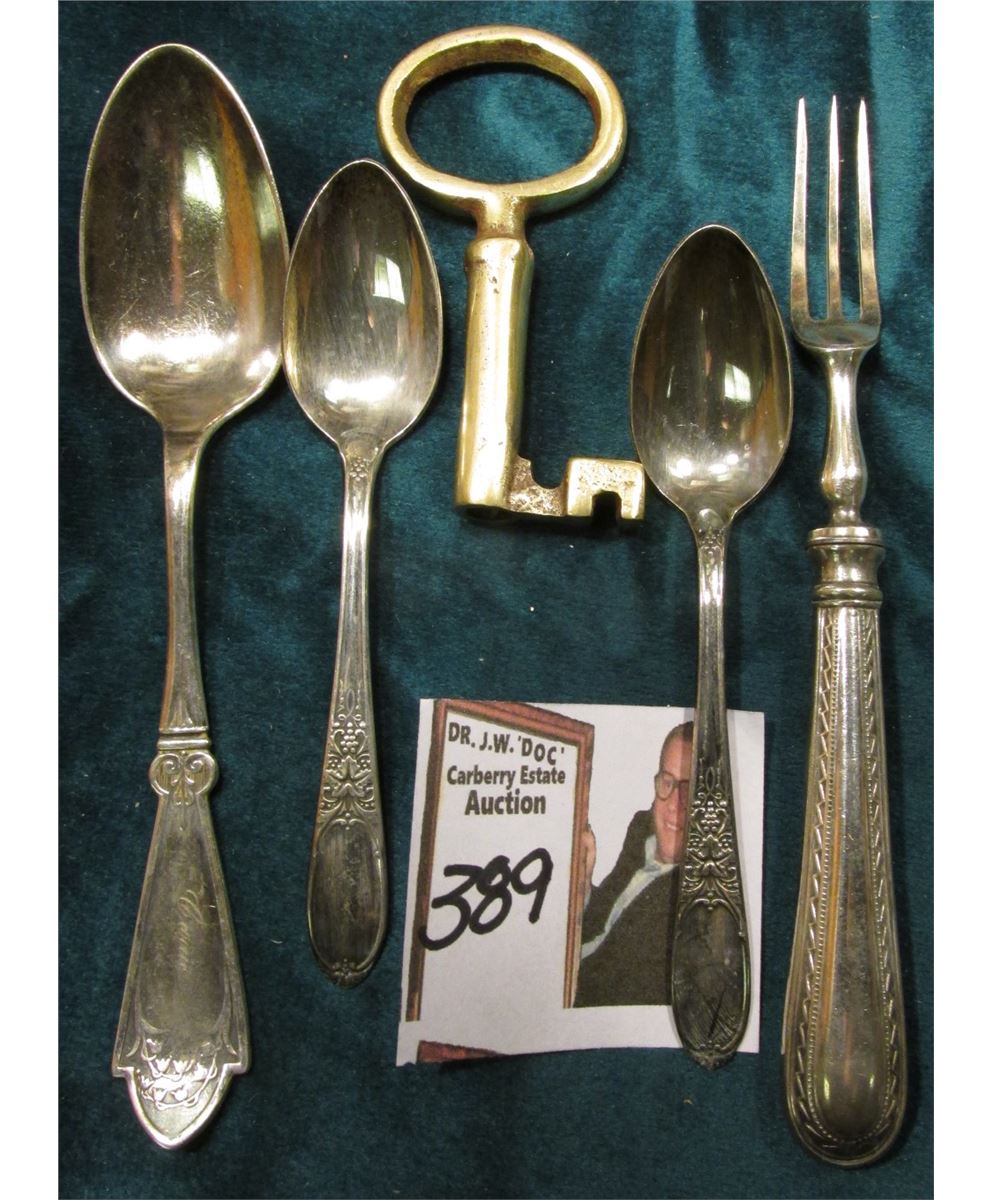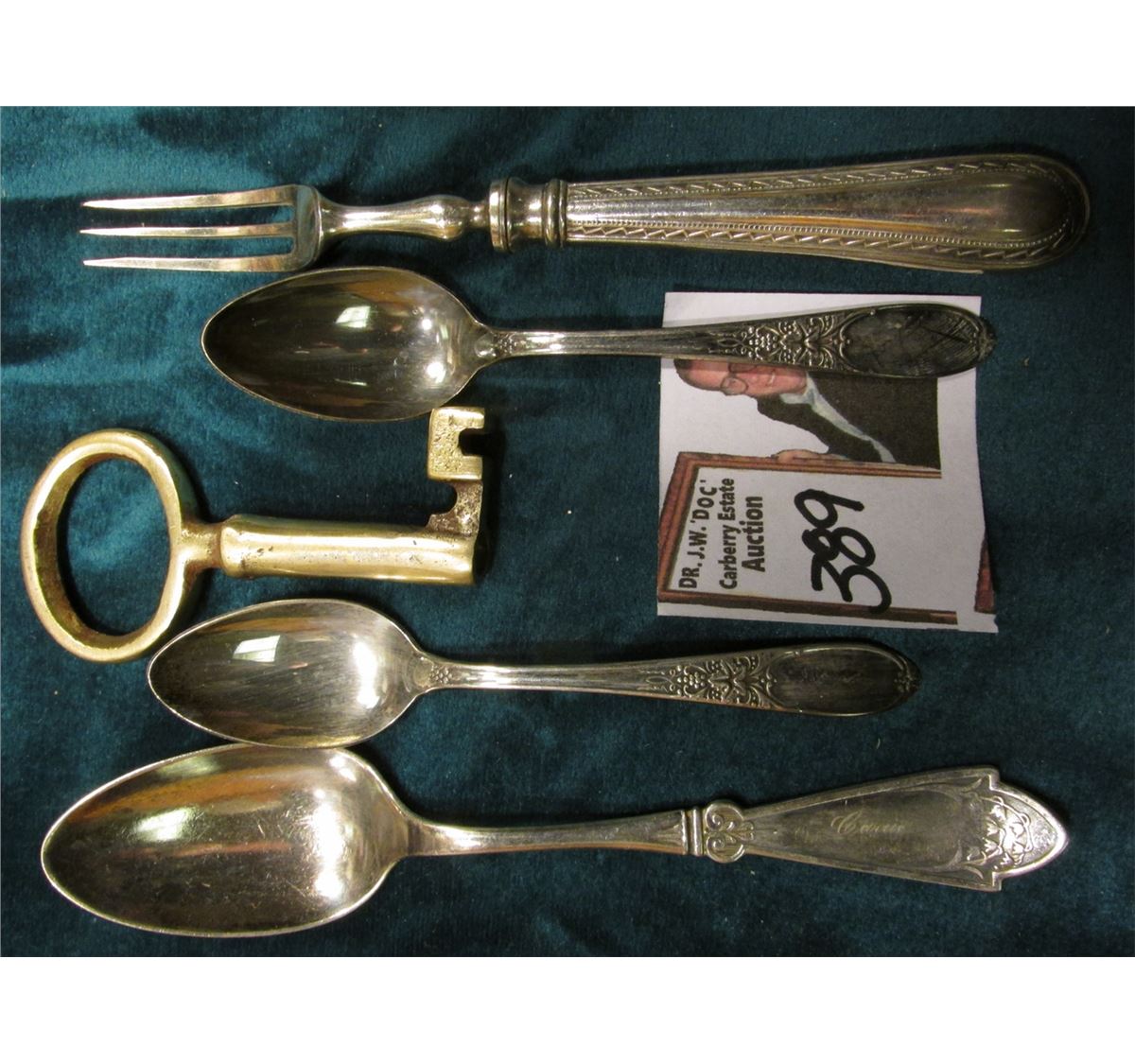 4 pcs. of Old Silverware and an Unusually Large old Key, which maybe brass.
