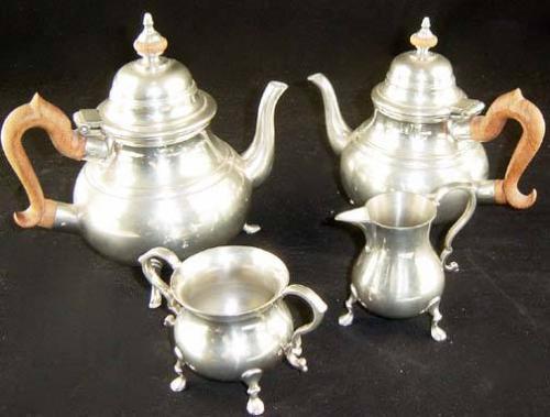 4 piece Stieff Pewter Tea Set in the Williamsburg Pattern, Coffee Pot, Teapot, Cream Pitcher & Sugar Bowl