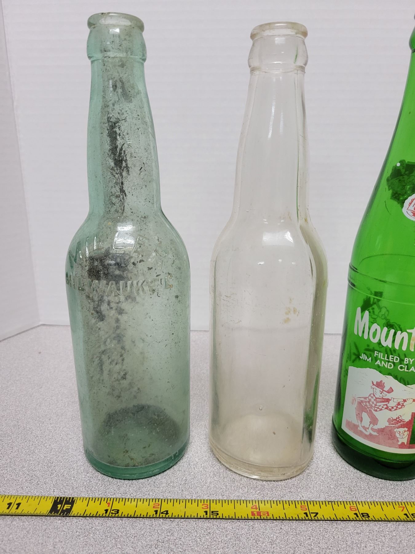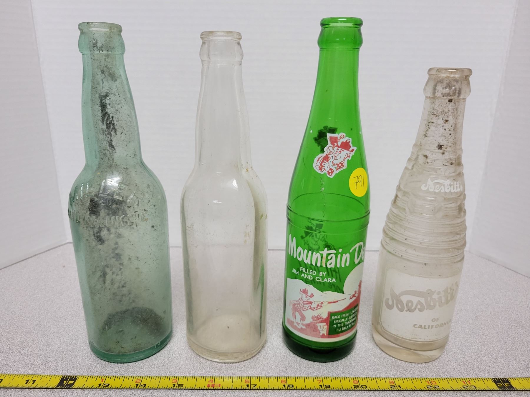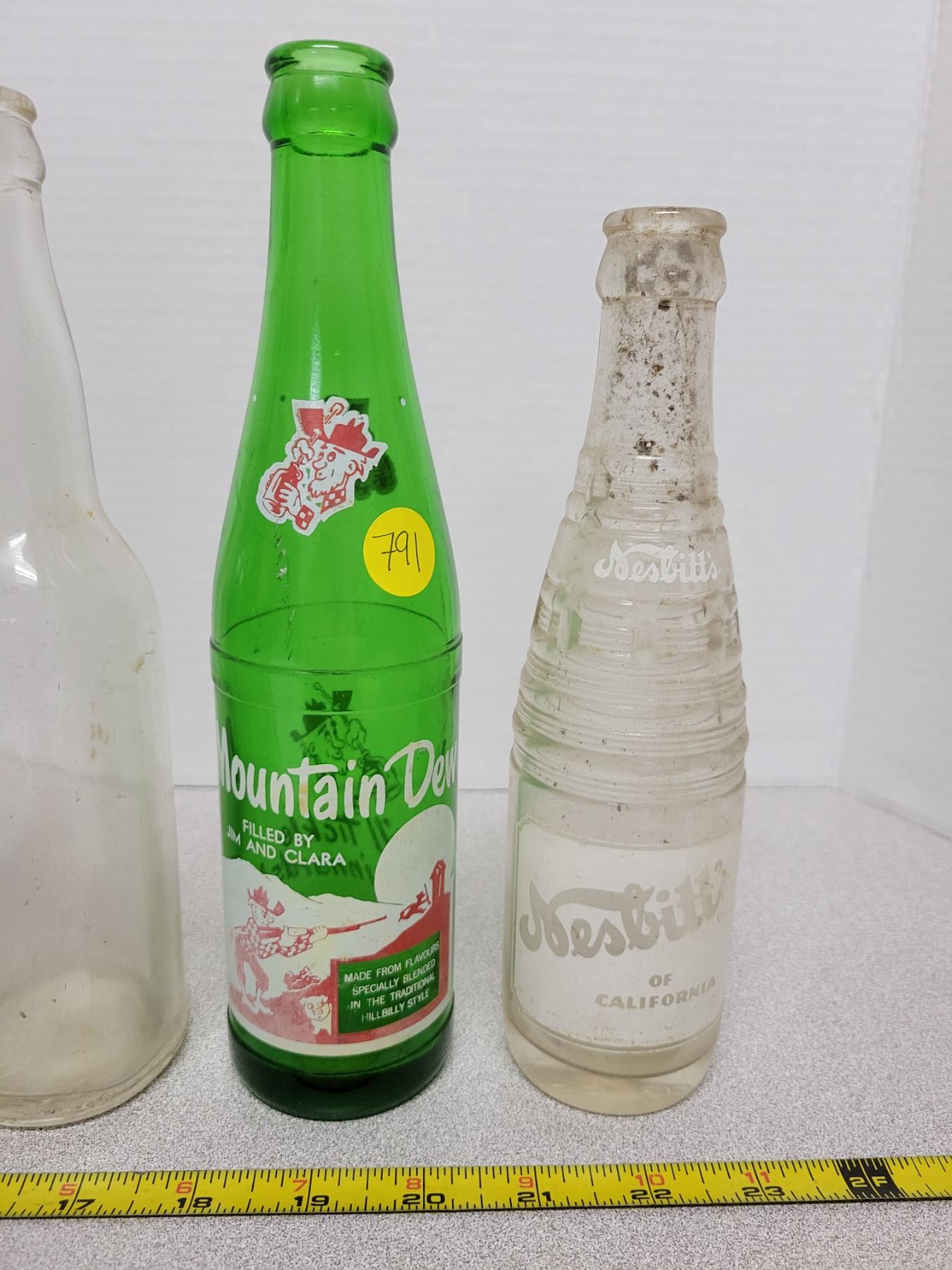 4 pop bottles, Mountain Dew, Nesbitt's soda and others