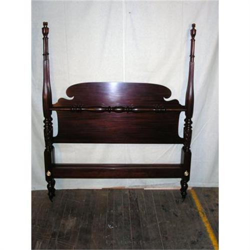 THIS IS A BEAUTIFUL FULL SIZE BED, COMPLETE WITH BOLT TOGETHER RAILS. THE POSTS ARE THIN AND ELEGANT,REEDED AND ARE ADORNED WITH BEAUTIFUL ACANTHUS LEAF CARVING. THE CONDITION IS EXCELLENT AND HAS IT'S ORIGINAL DEEP RED MAHOGANY FINISH.