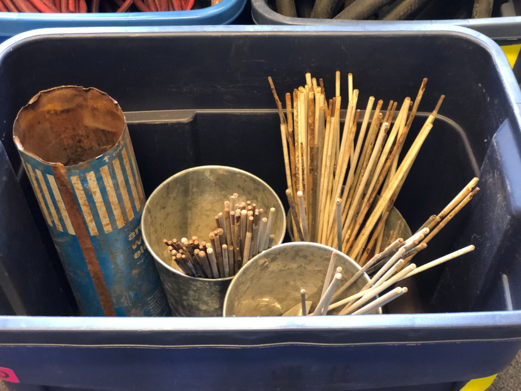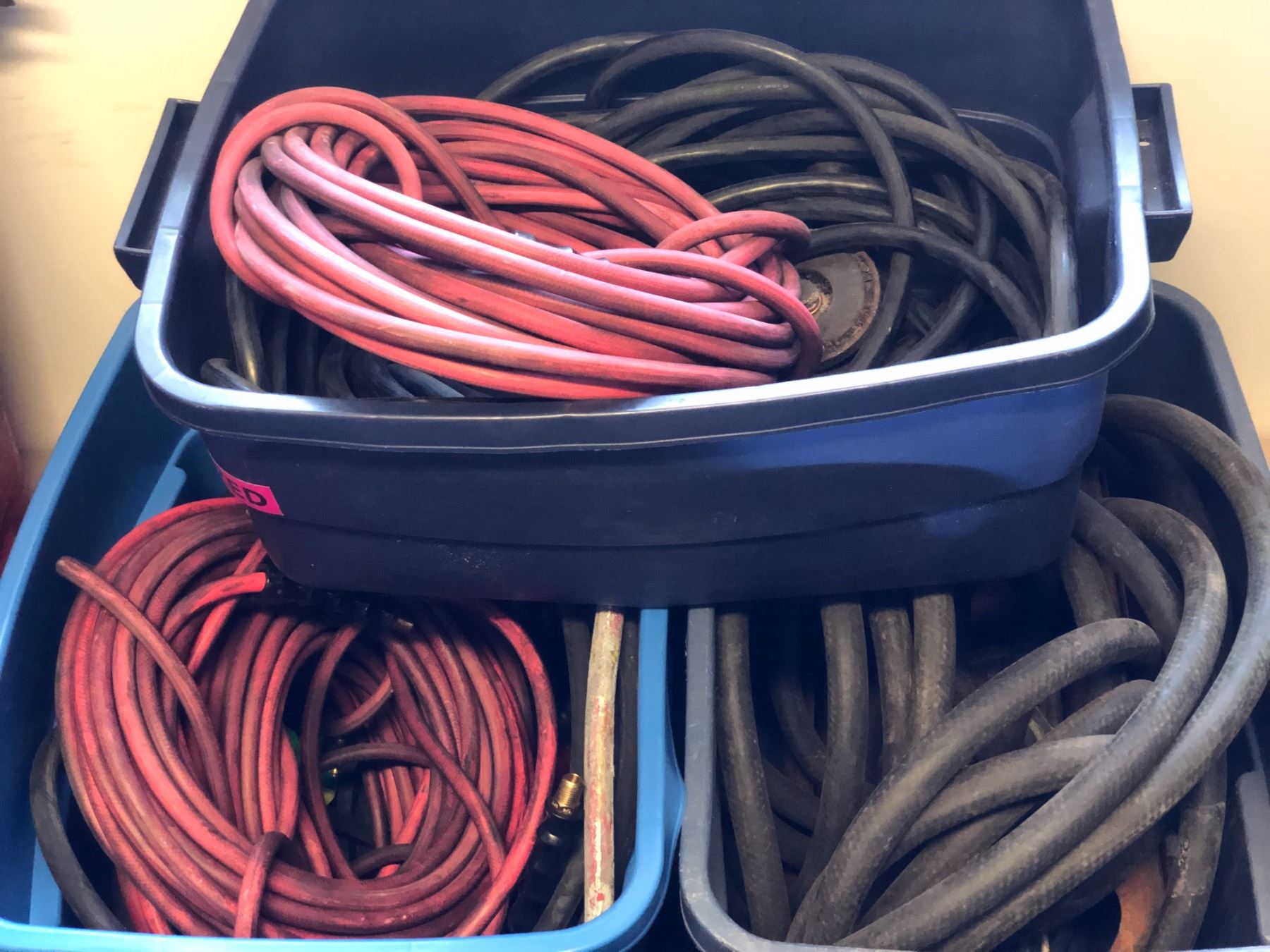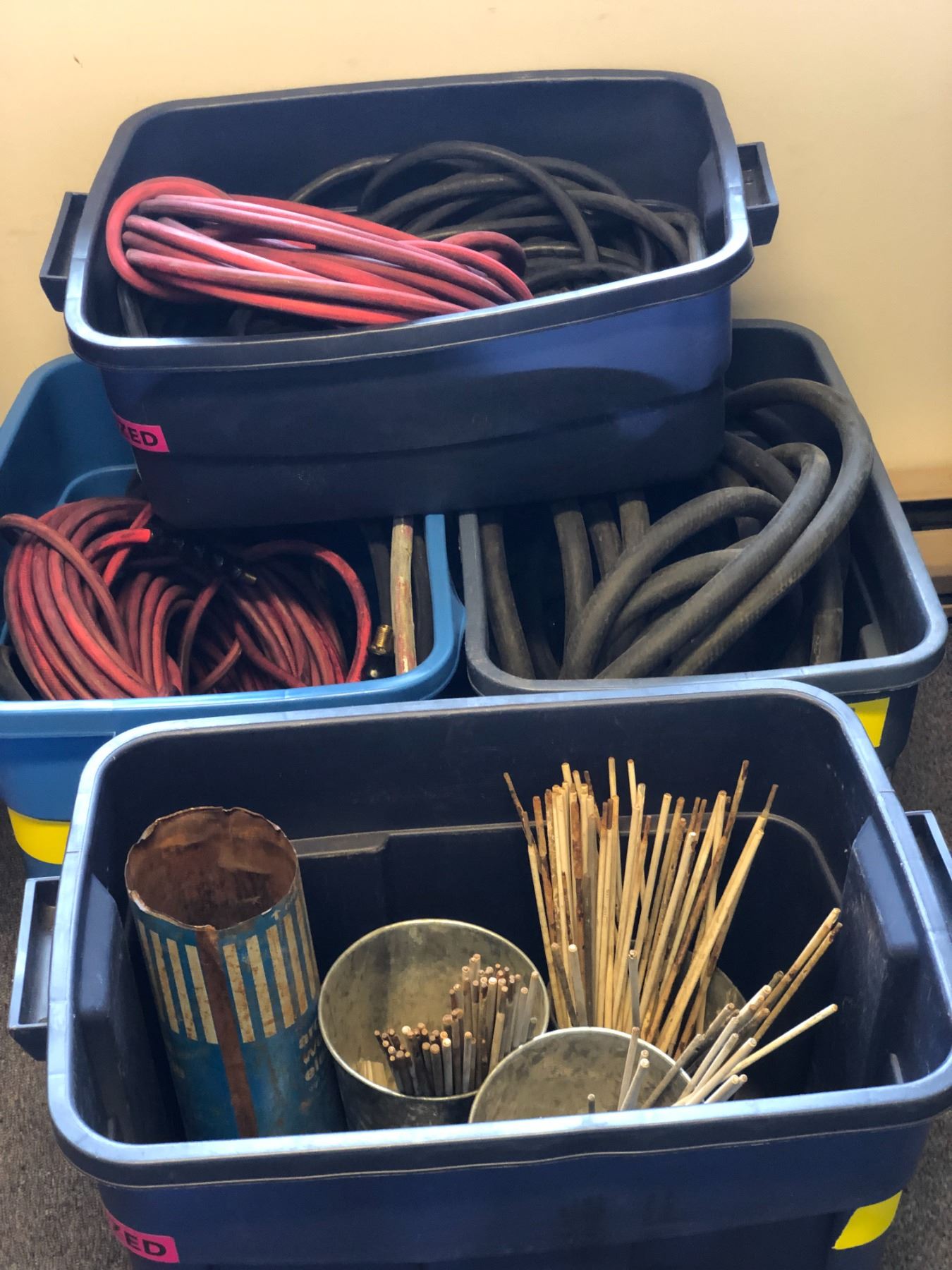 4 rubber made containers of assorted hose lines / welding electrodes etc (From the superhero show)