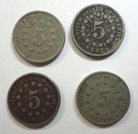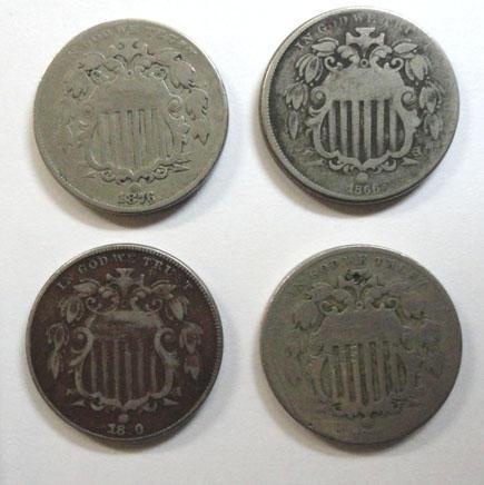 4 scarce date shield nickels; 1866 VG-1870 F/VF-1872 G-1876 Fine
