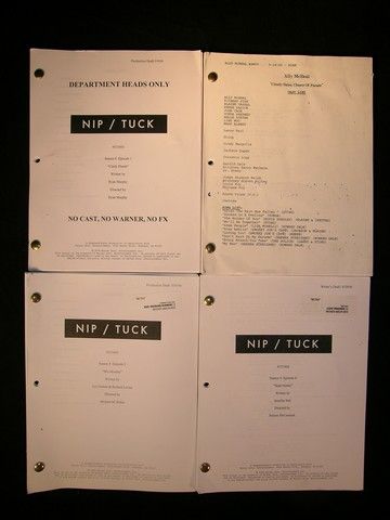 Three scripts from the hit series "Nip/Tuck" and one script from the classic series "Ally McBeal." Nip/Tuck scripts include season 4 episode #1 "Cindy Plumb," episode #2 "Blu Mondae" and episode #4 Shari Noble". Ally McBeal script is dated 3-14-01 and entitled "Cloudy Skies, Chance of Parade".