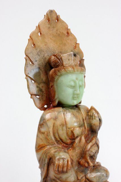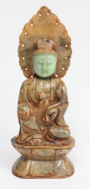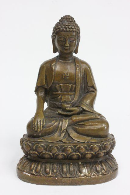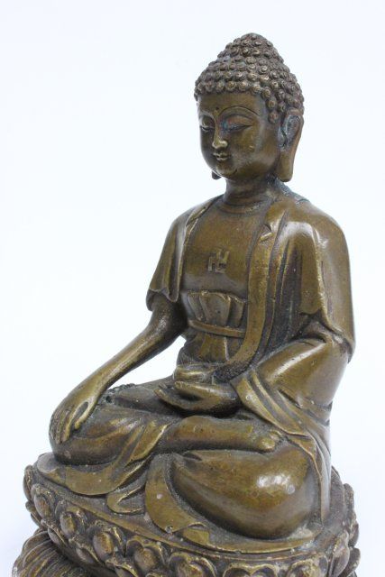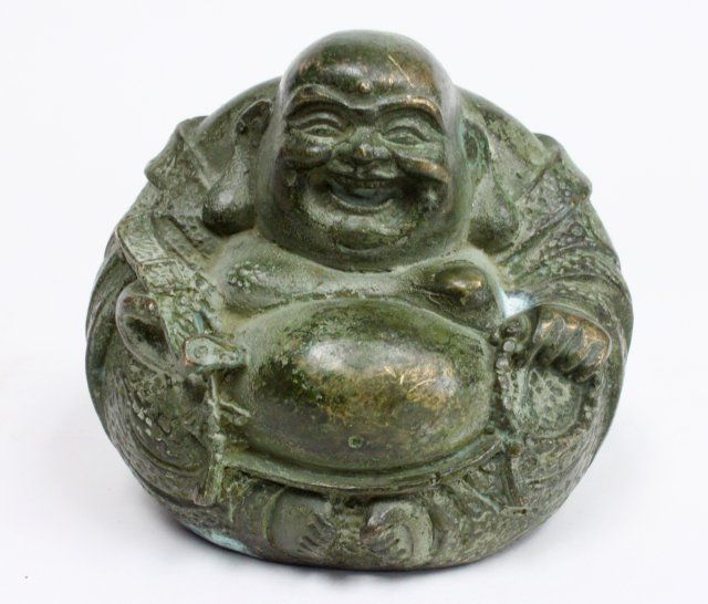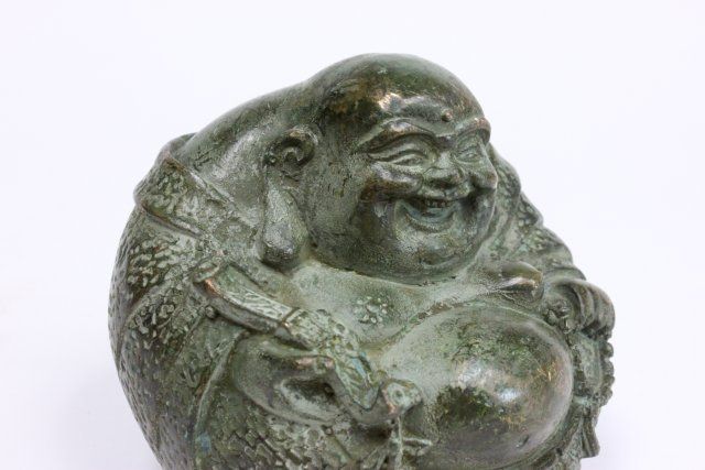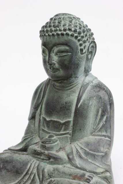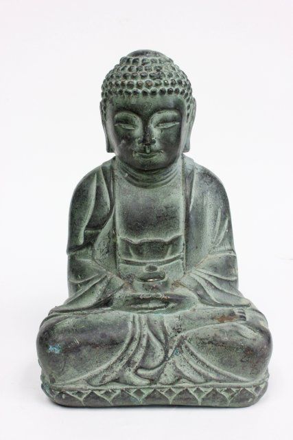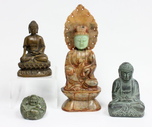 2 - bronze, approx. 3.5" H & 7.25" H. 1 - metal, verde green, approx. 6.5" H. 1 - stone Buddha with minor loss, approx. 12.75" H.
