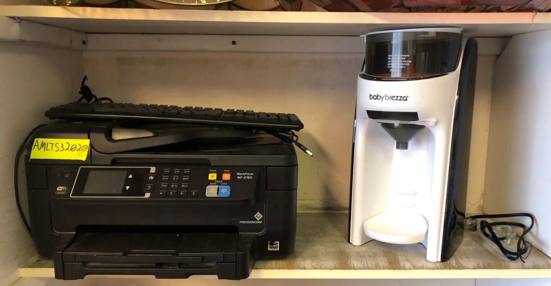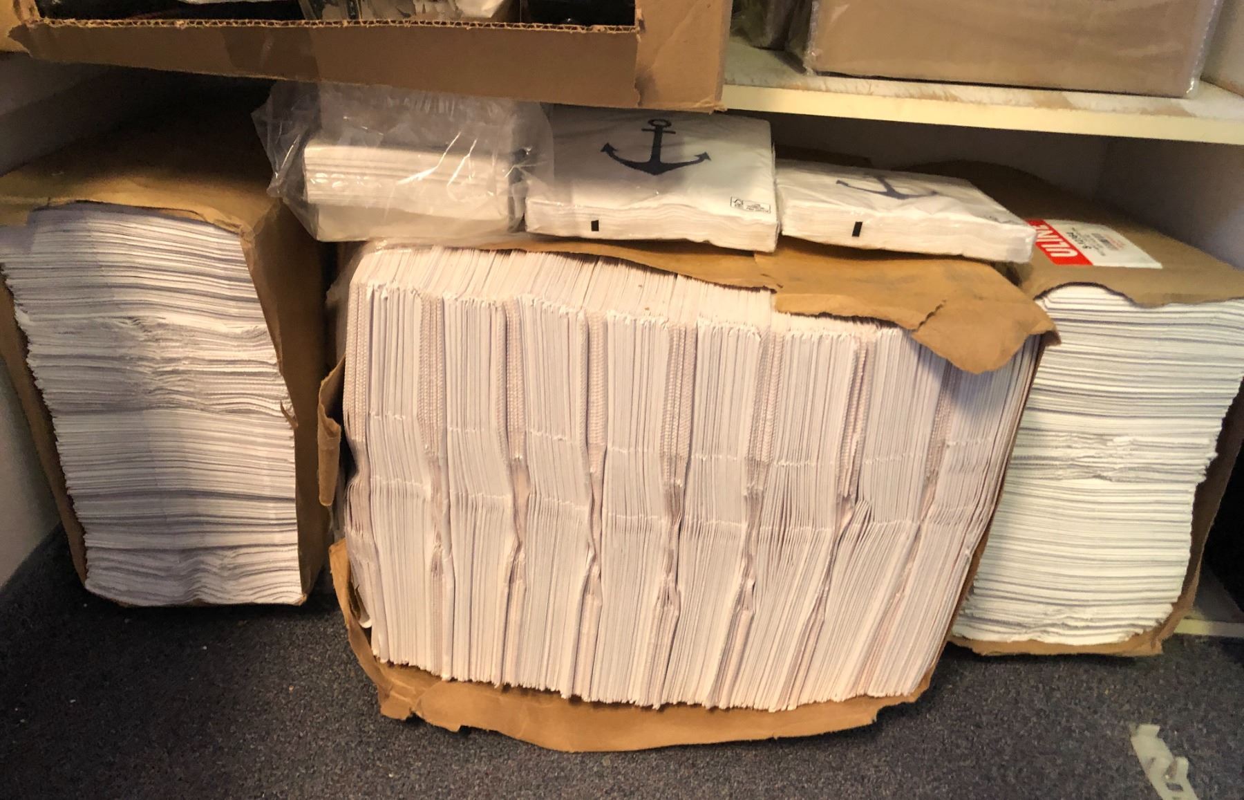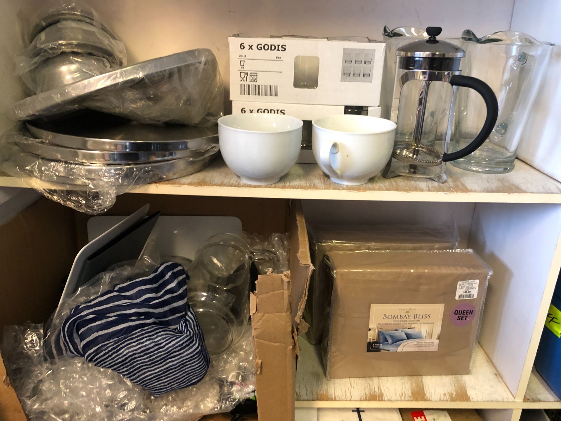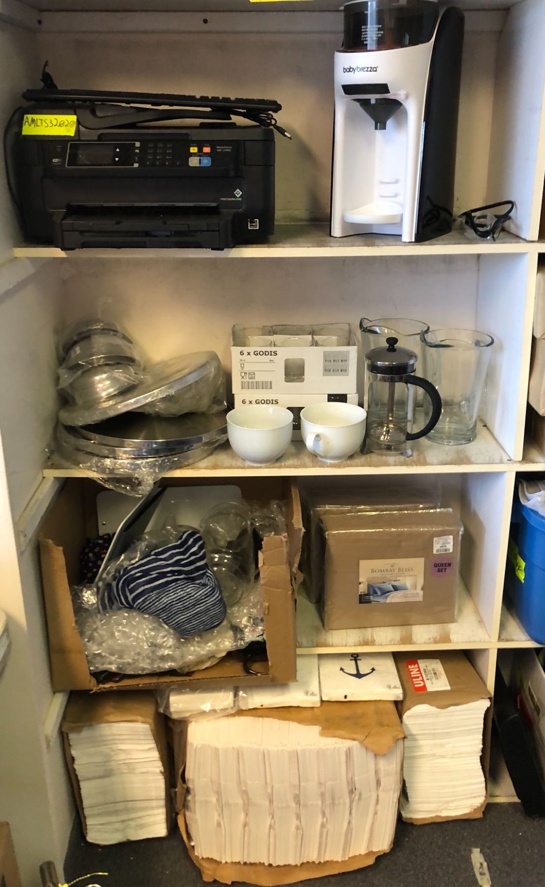 4 shelves full of misc. set dec items - includes large group of white grocery bags/ kitchenware/ printer etc.