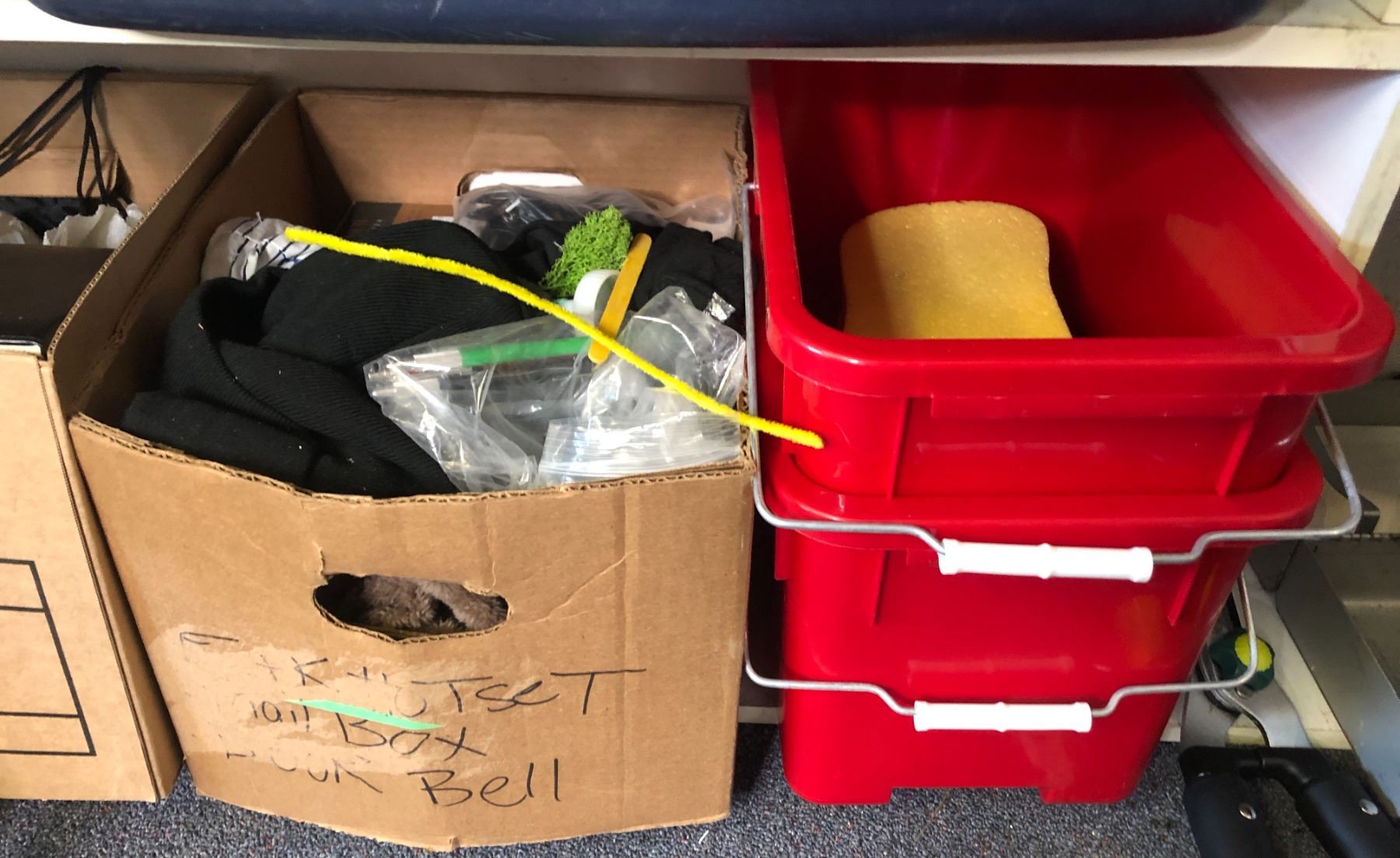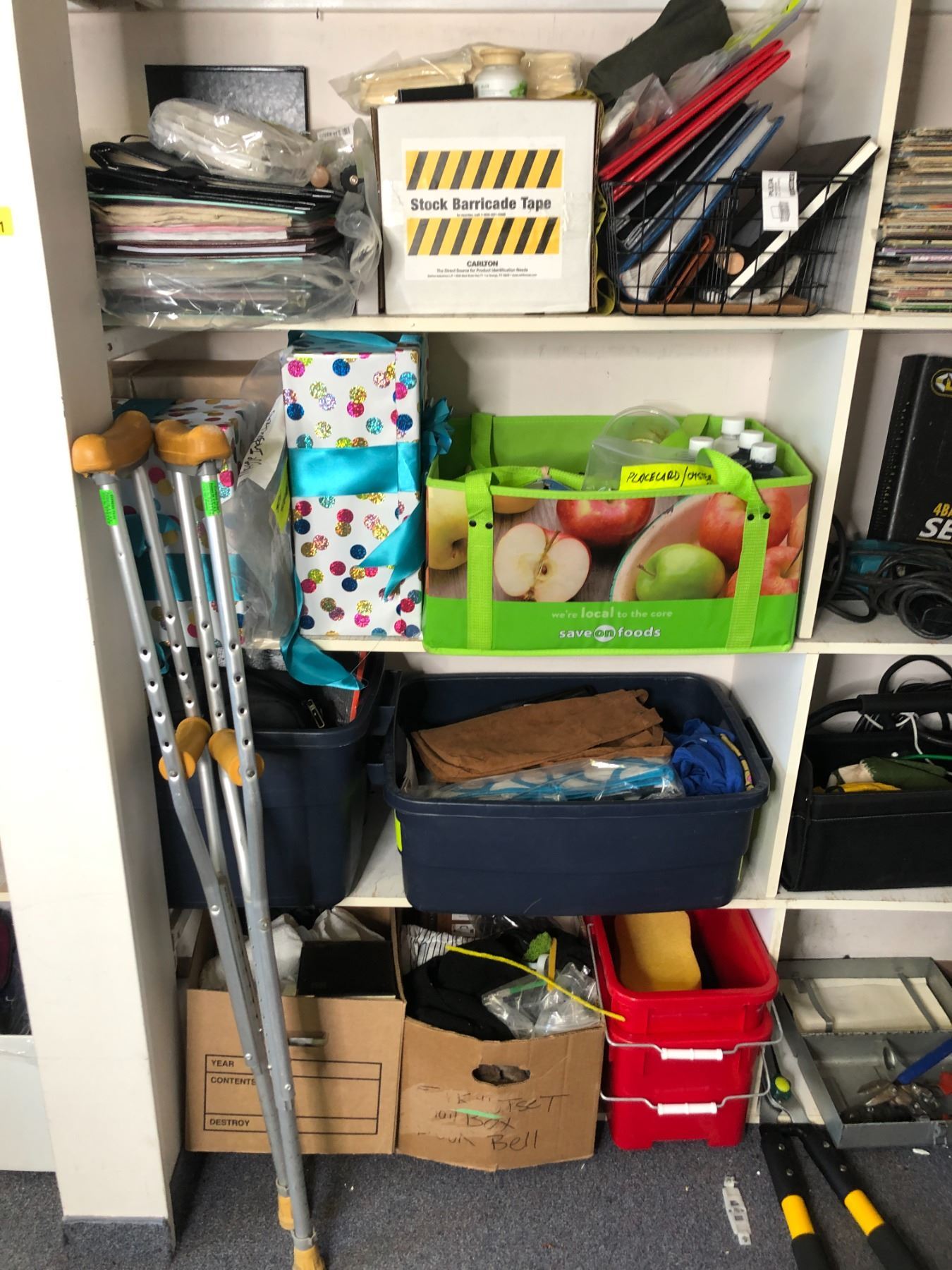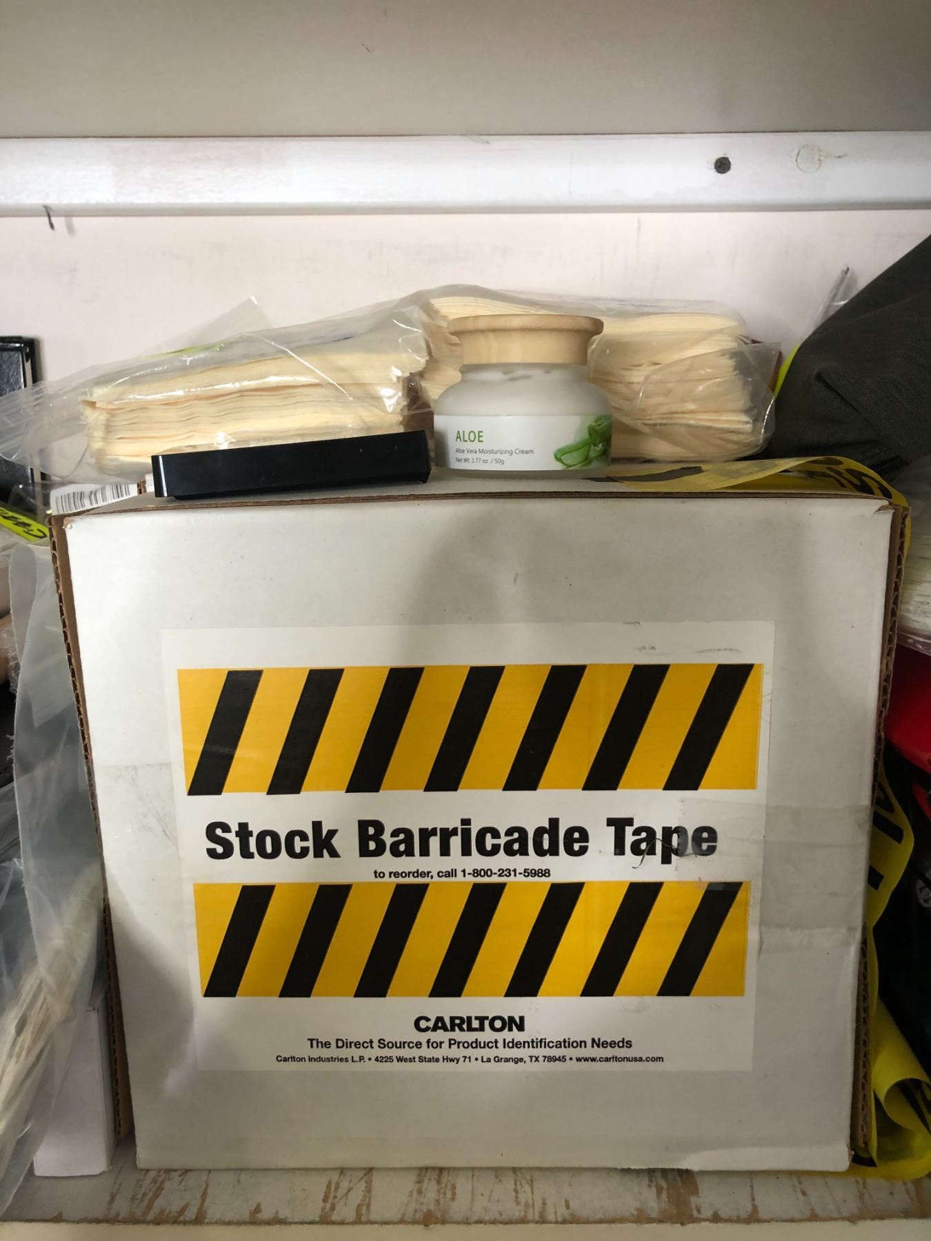 4 shelves full of misc. set dec items - includes prop parcels/ 3 boxes of Boston barricade tape/ assorted paint bottles/ crutches etc.