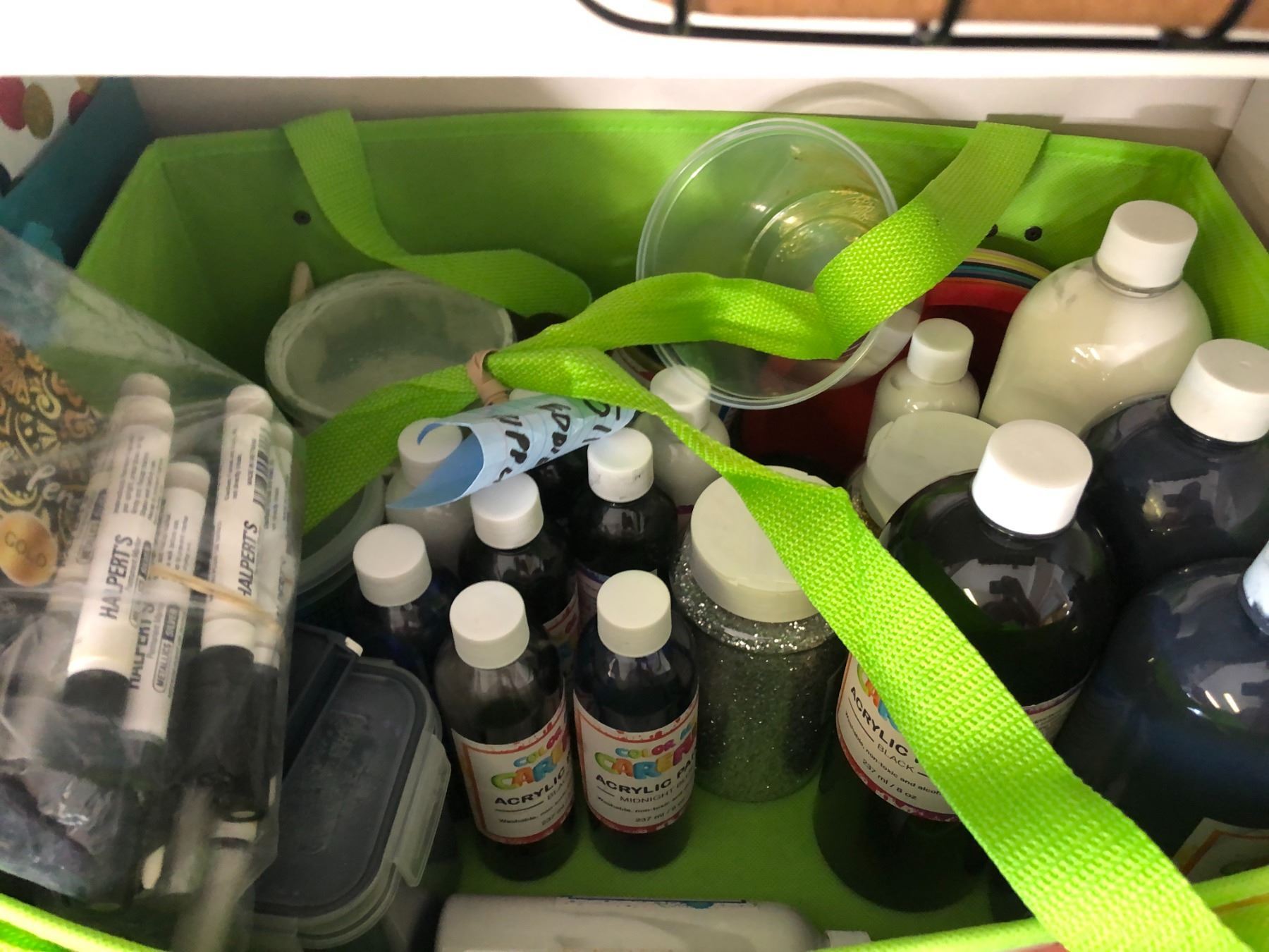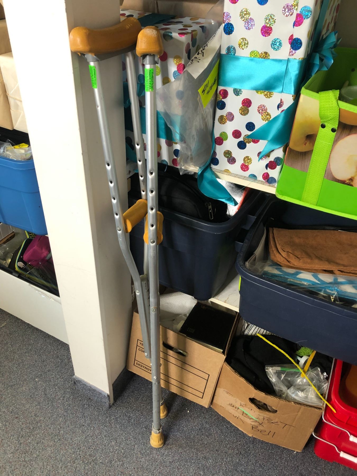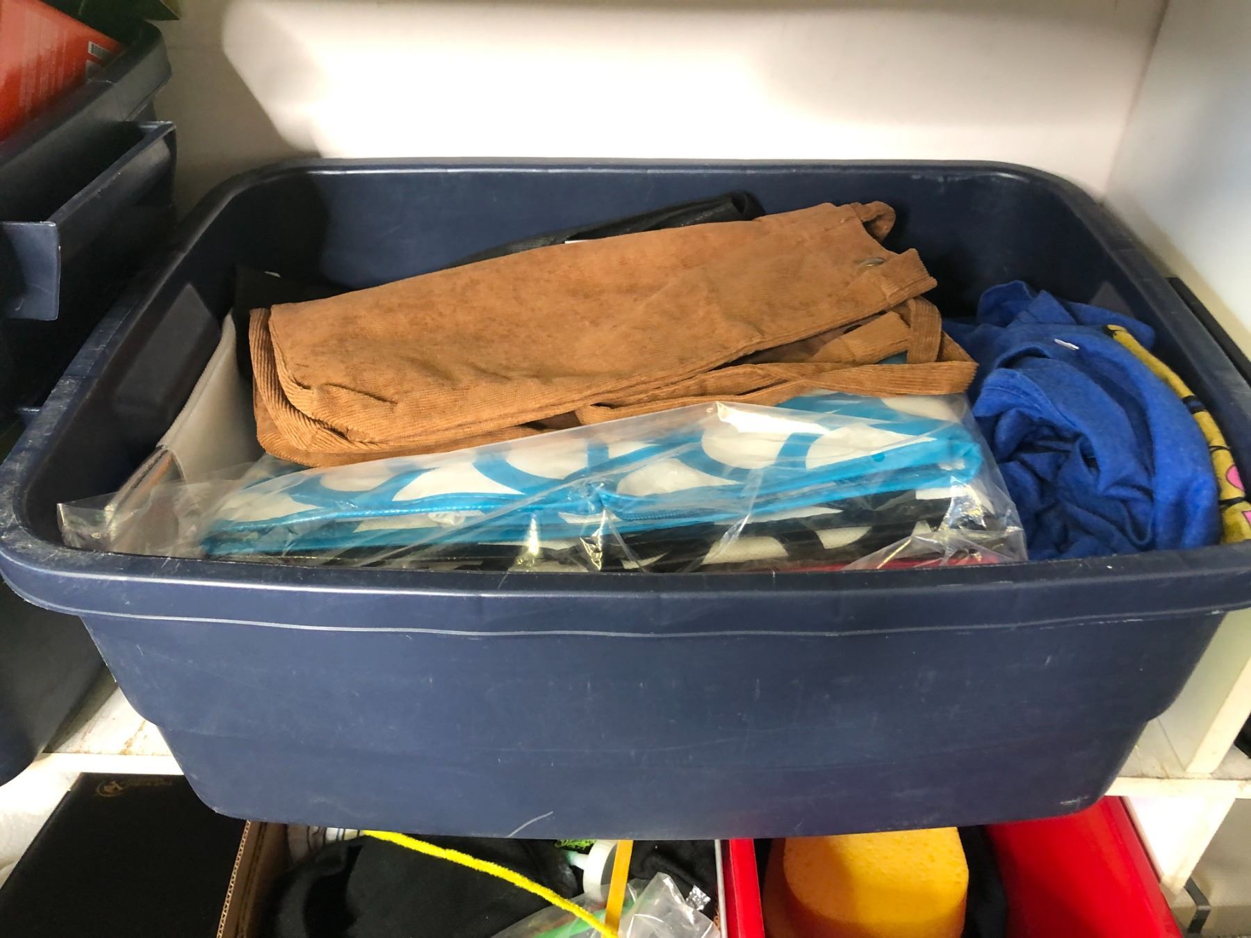 4 shelves full of misc. set dec items - includes prop parcels/ 3 boxes of Boston barricade tape/ assorted paint bottles/ crutches etc.
