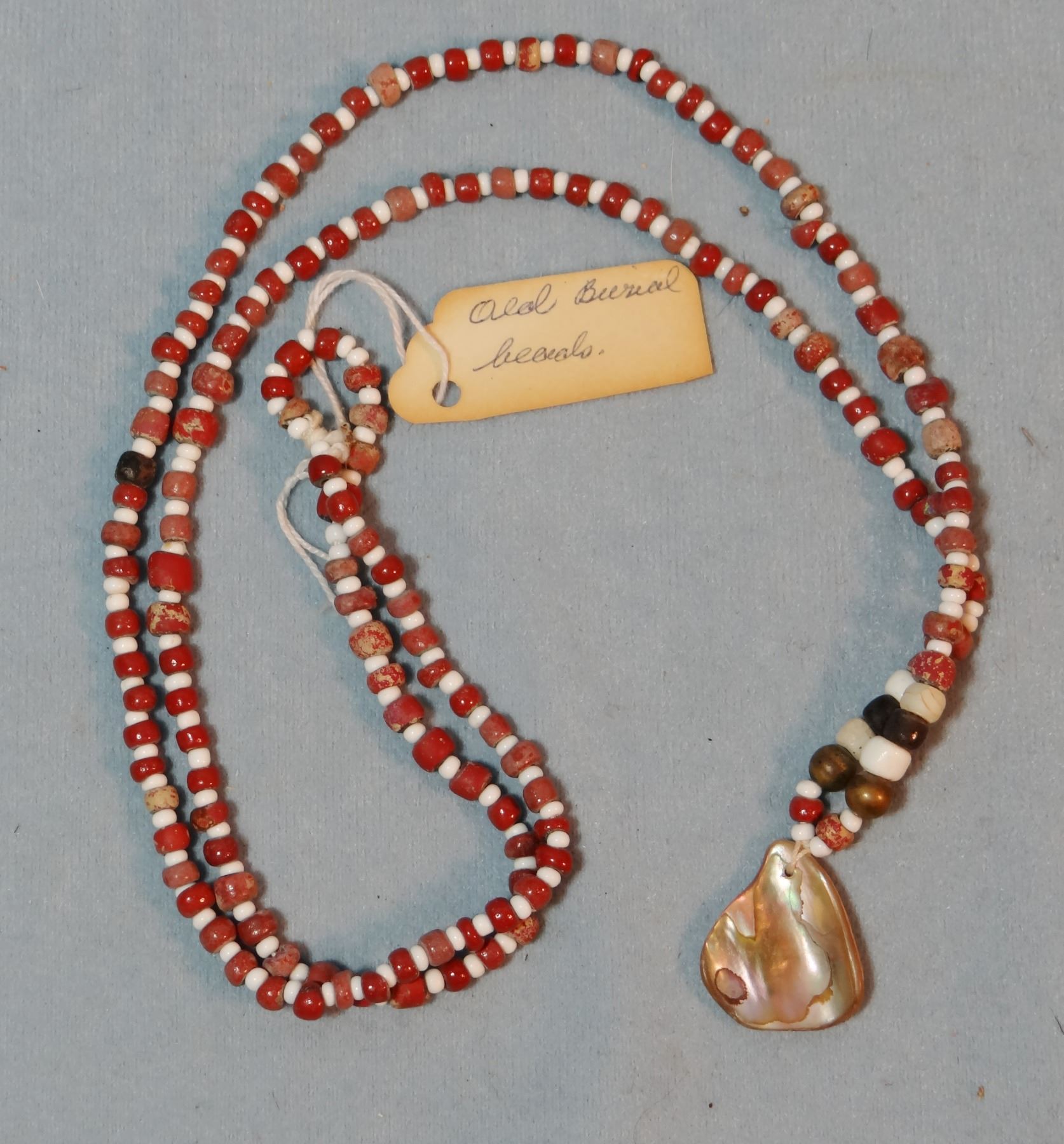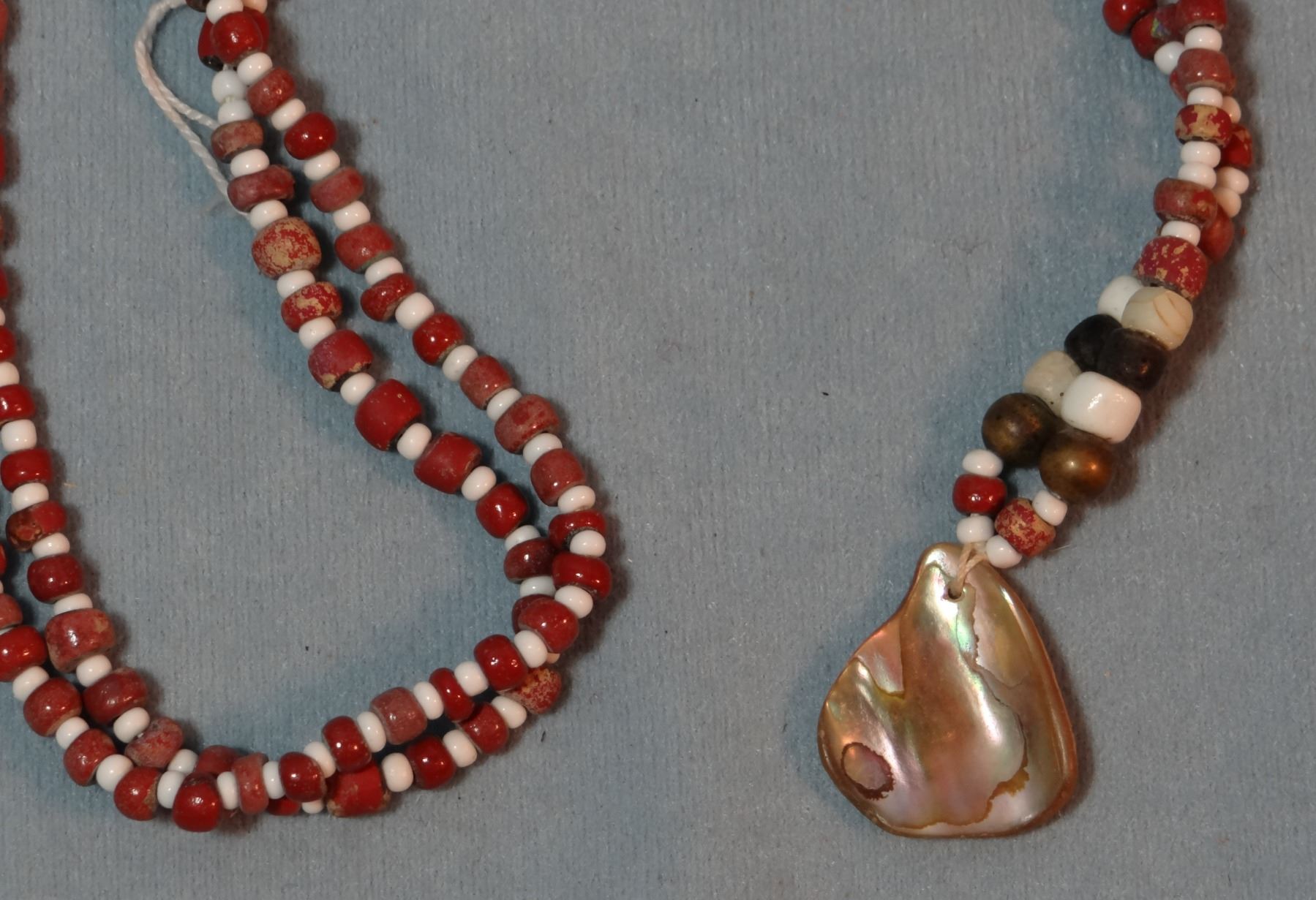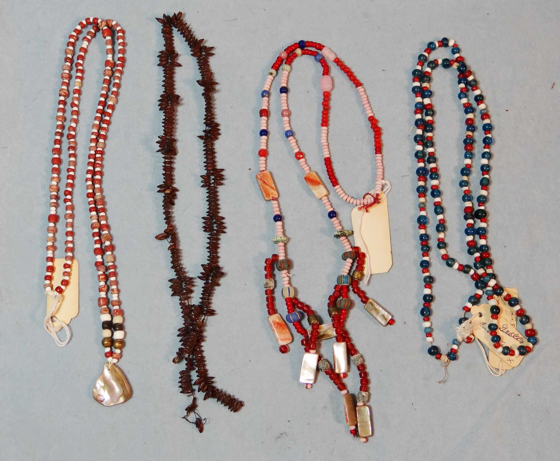 (4) strings of very old beads: burial beads w/abalone shell, beads w/abalone trim, NW Coast beads from Gillis Collection, Yreha Museum seed necklace