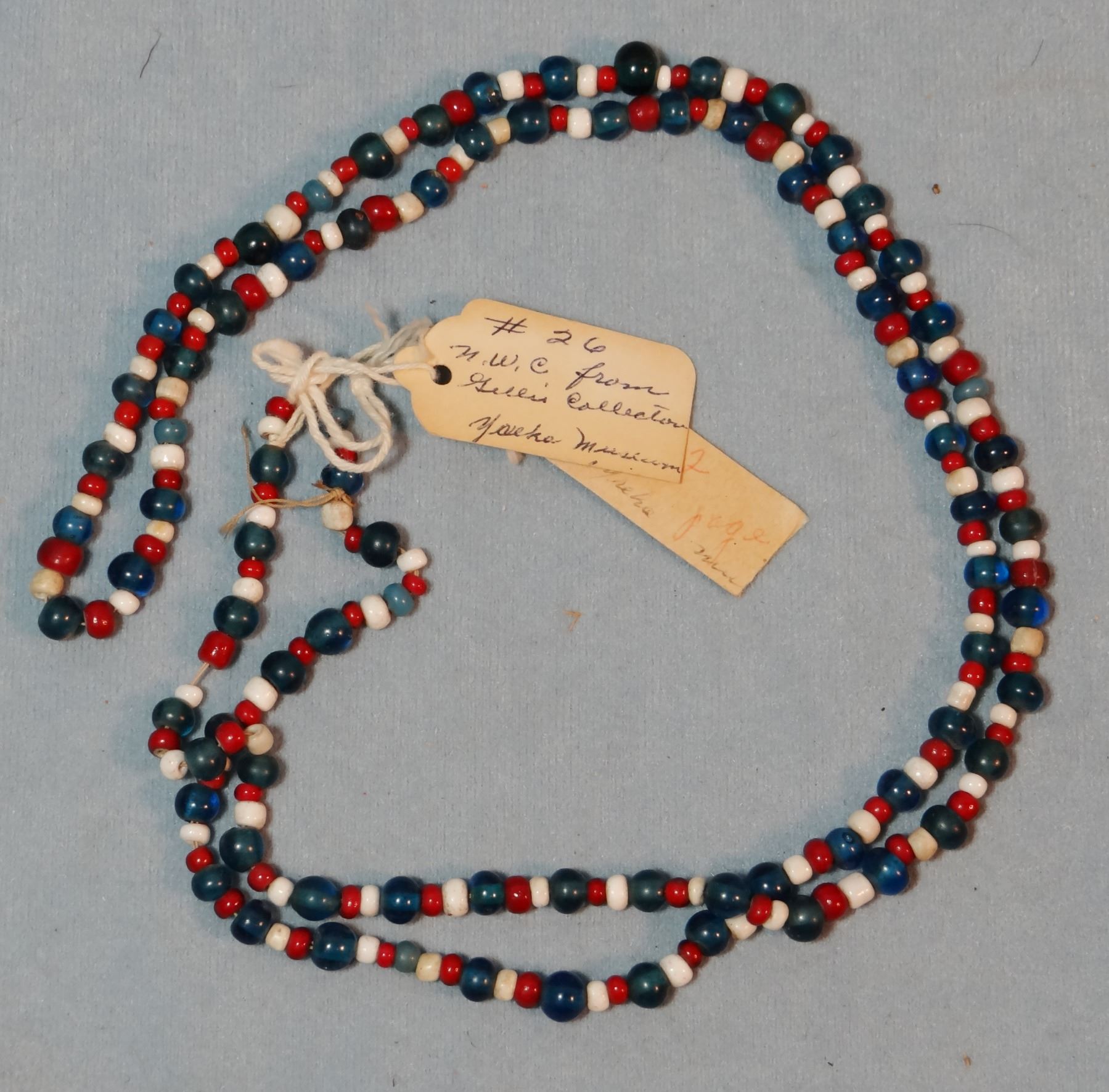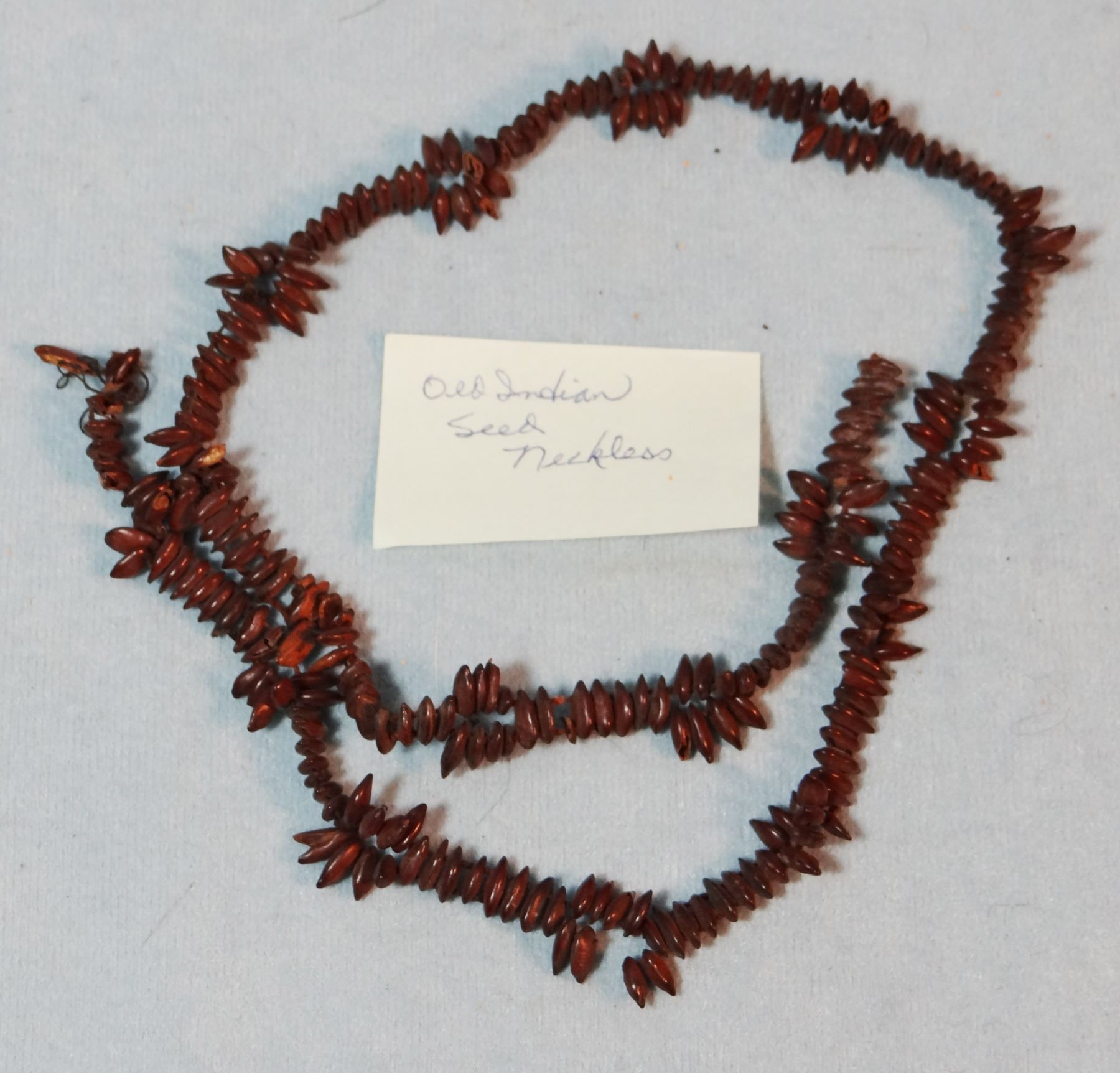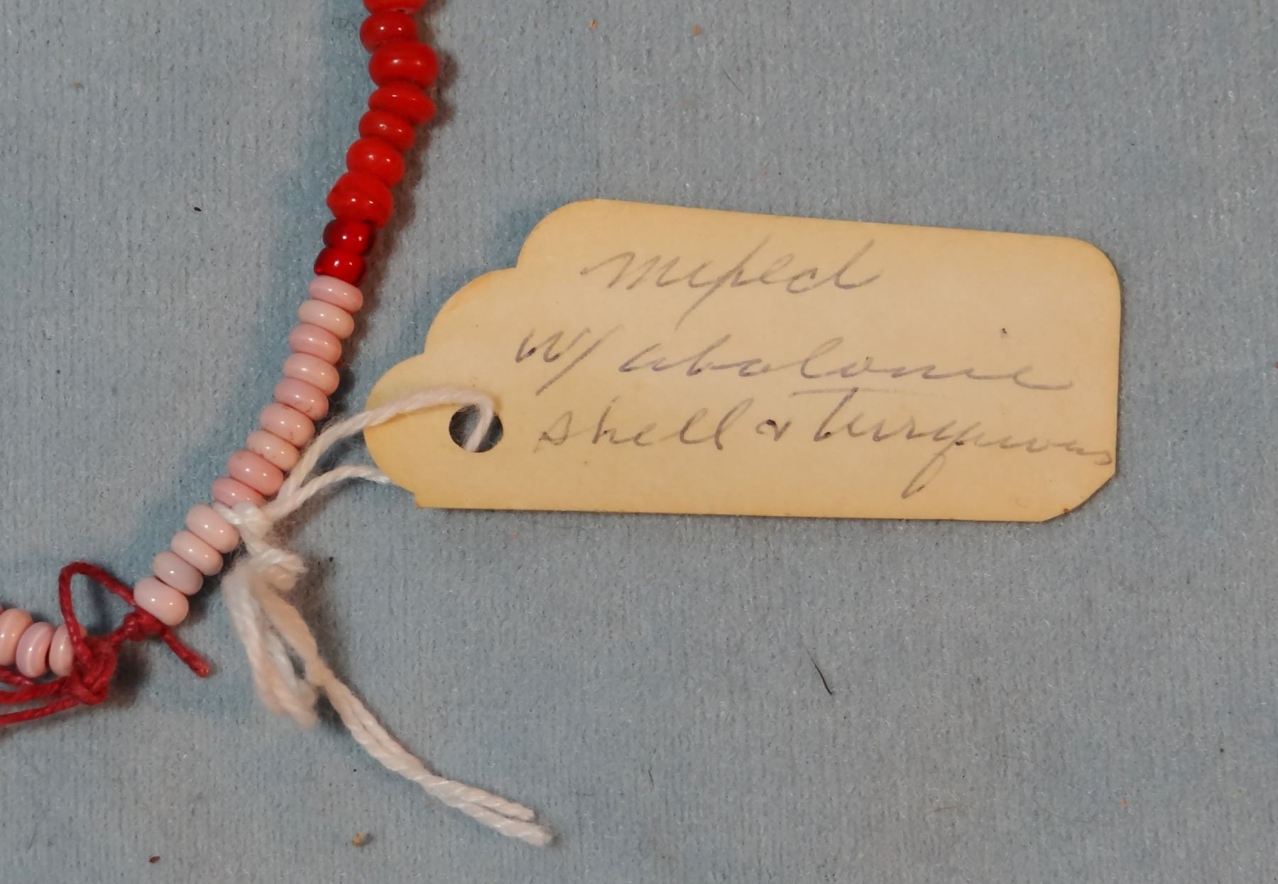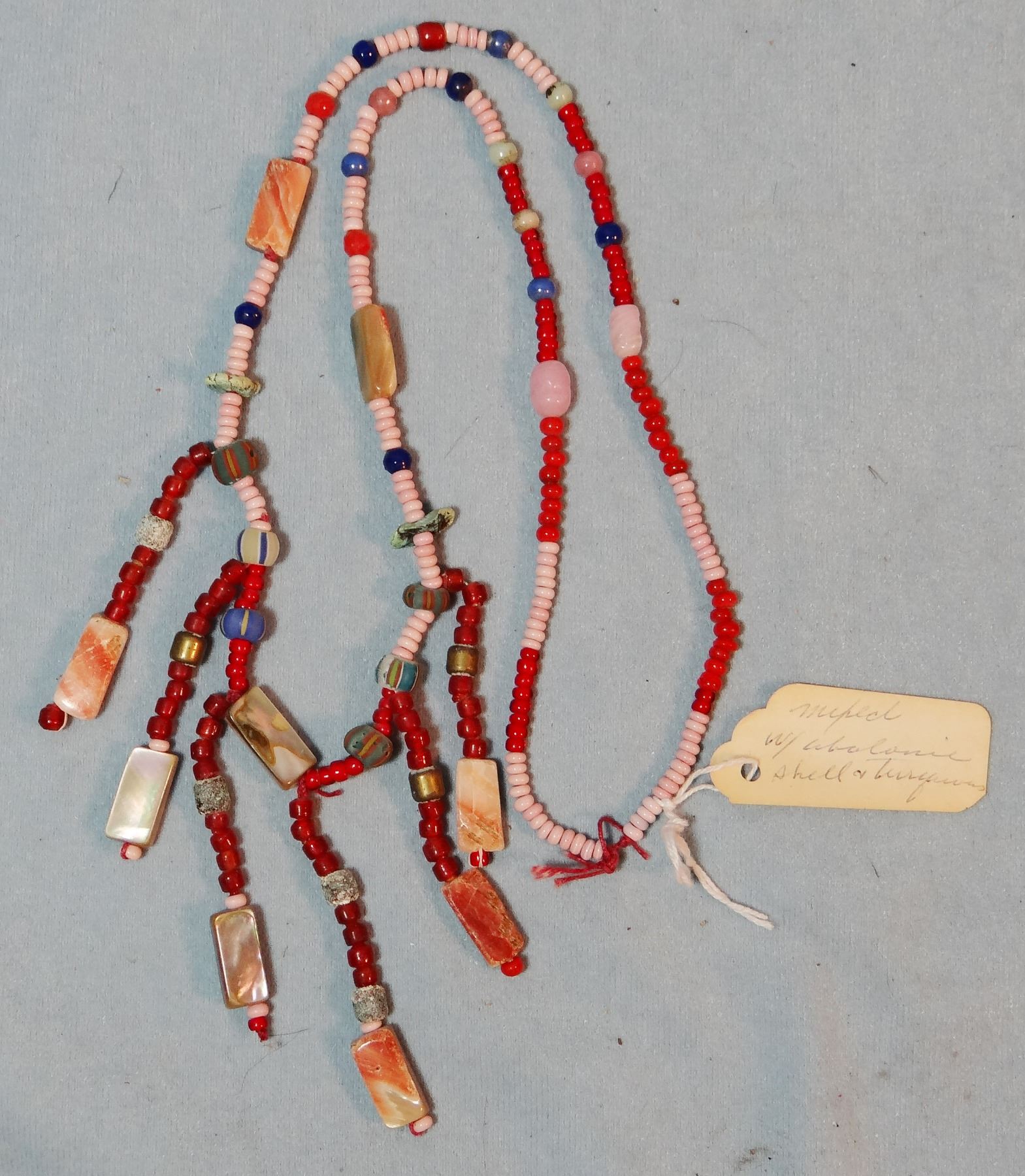 (4) strings of very old beads: burial beads w/abalone shell, beads w/abalone trim, NW Coast beads from Gillis Collection, Yreha Museum seed necklace