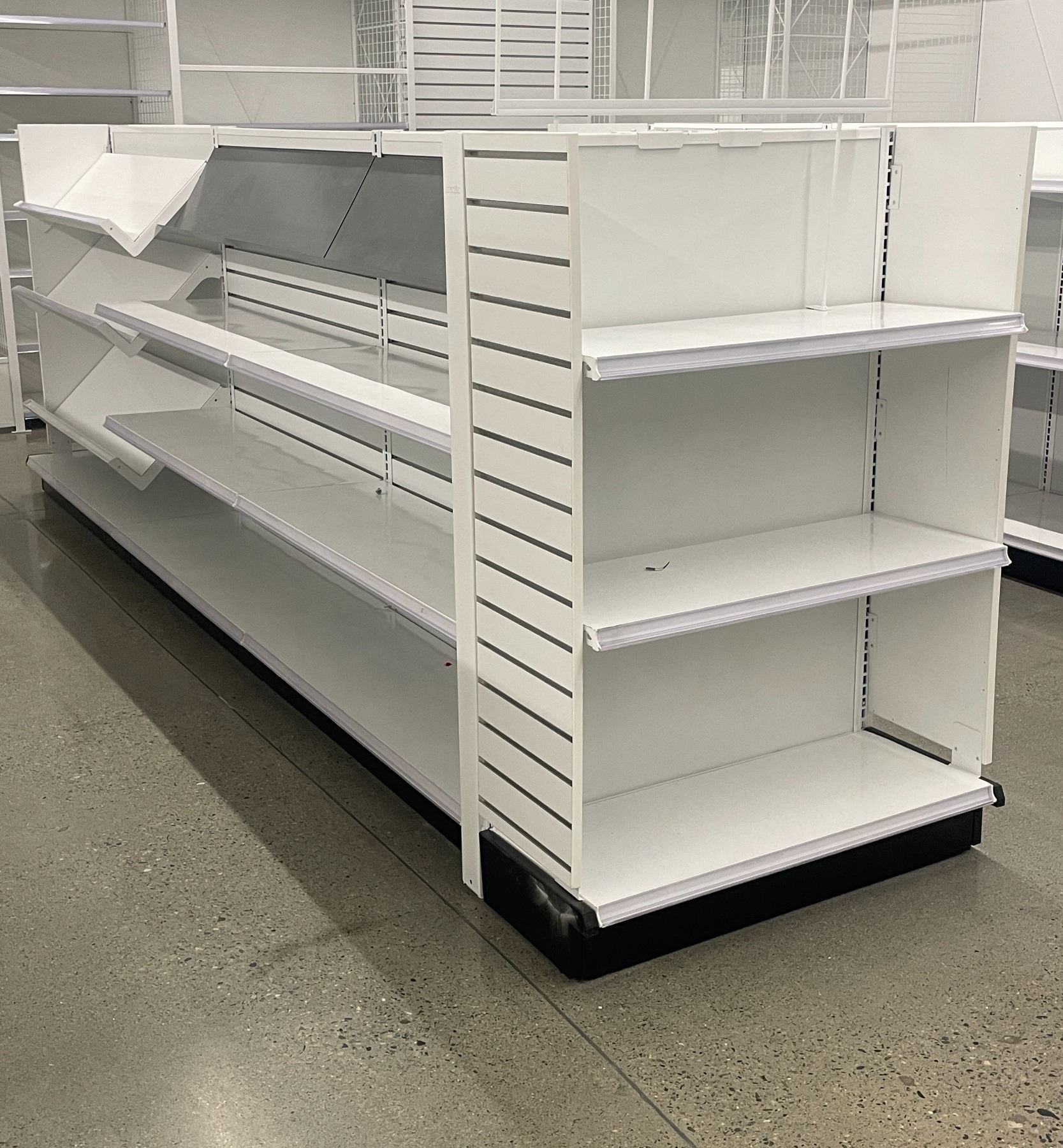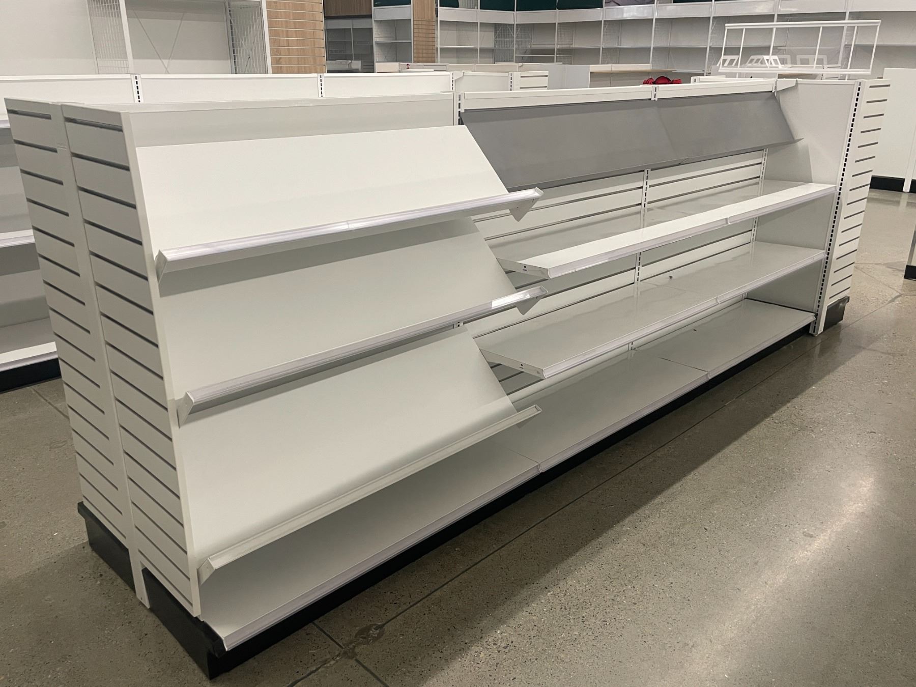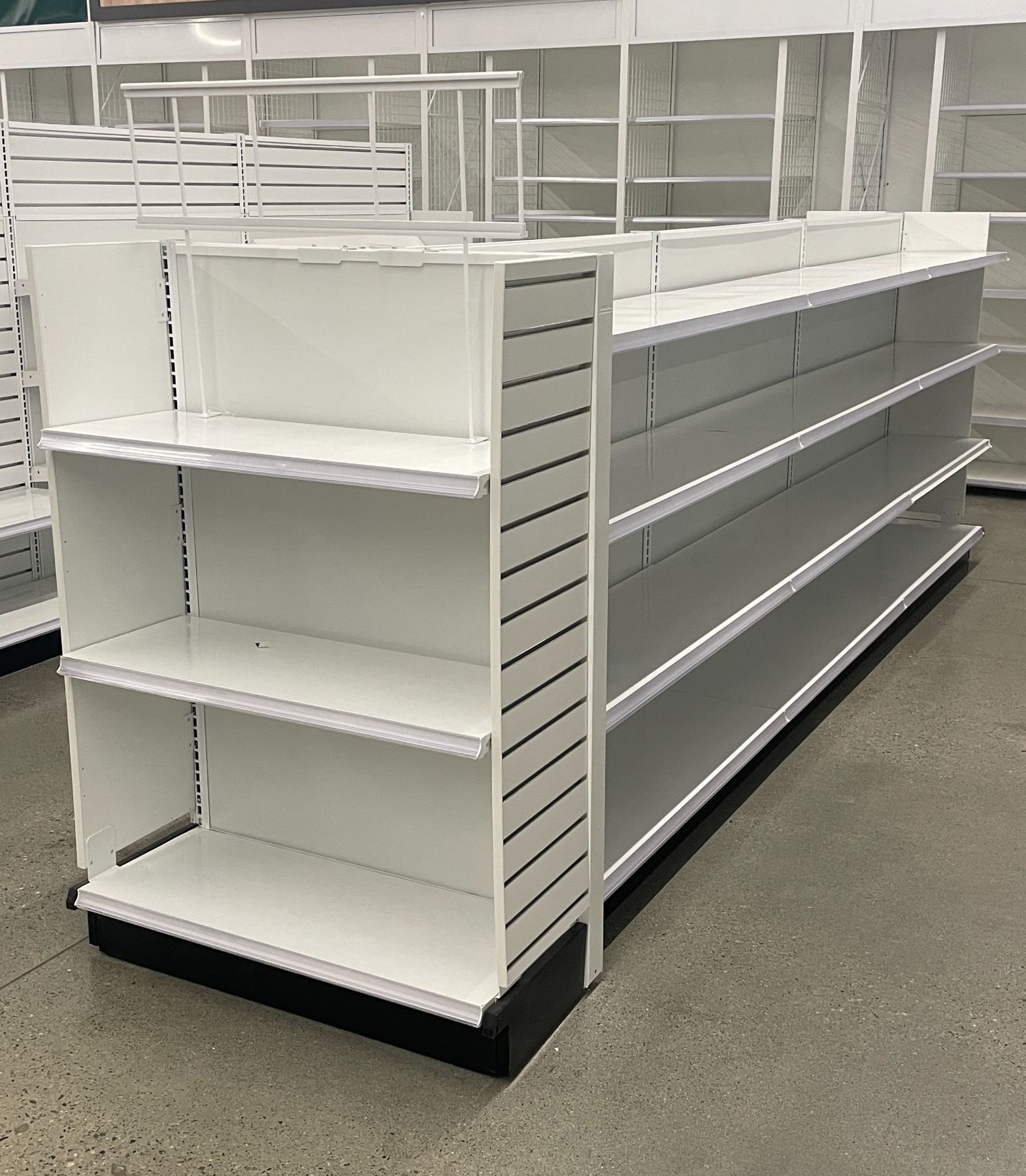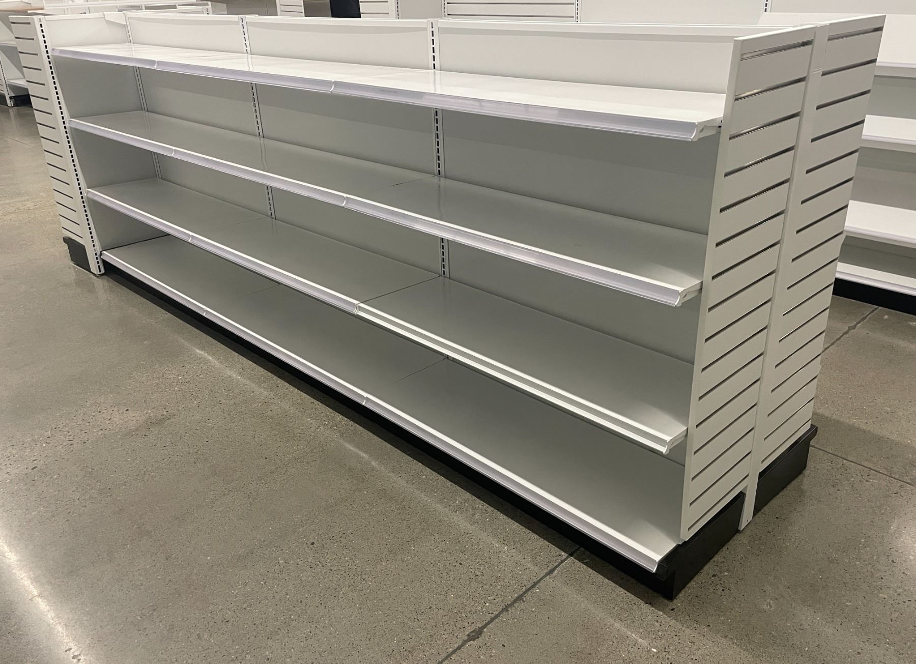 4 tier retail shelving double-sided gondola with single end cap (approx. 168in W 55 1/2 H (66in H w/sign holder) 38in D - excellent condition - Madix brand) BIDDERS ARE RESPONSIBLE FOR ALL COSTS ASSOCIATED WITH PICKUP OF THEIR LOTS INCLUDING BUT NOT LIMITED TO RENTAL OF EQUIPMENT, FORKLIFTS, LABOUR, TRUCKING, TOOLS ETC.