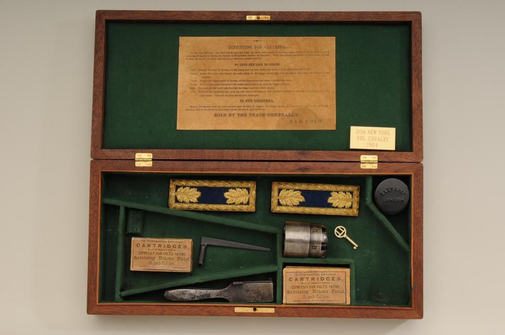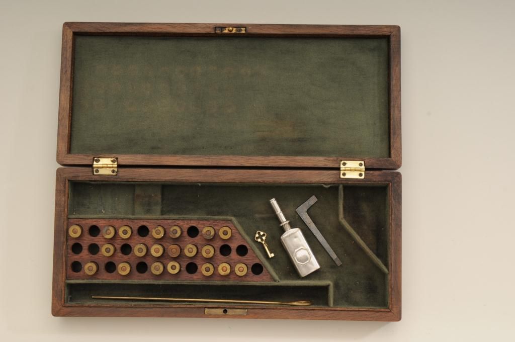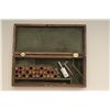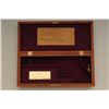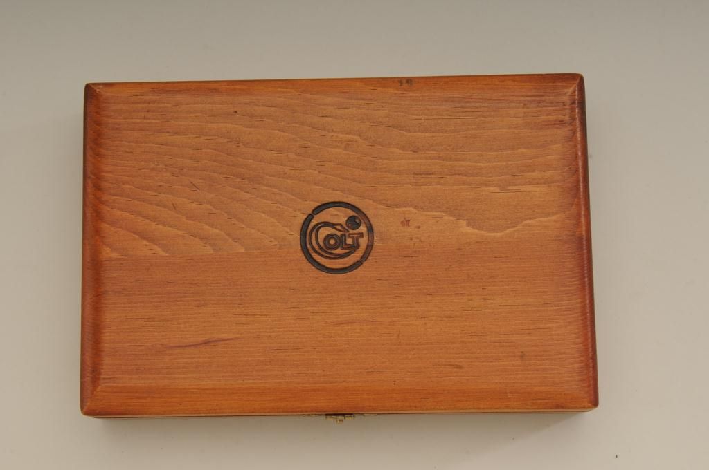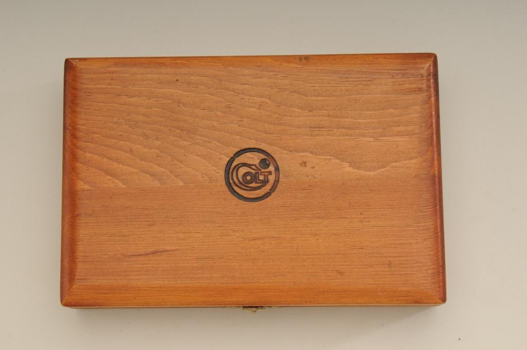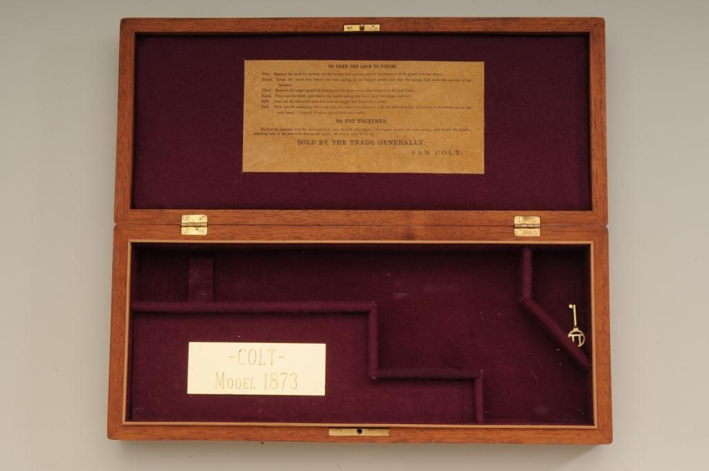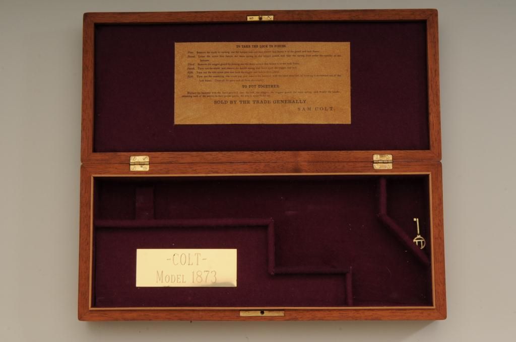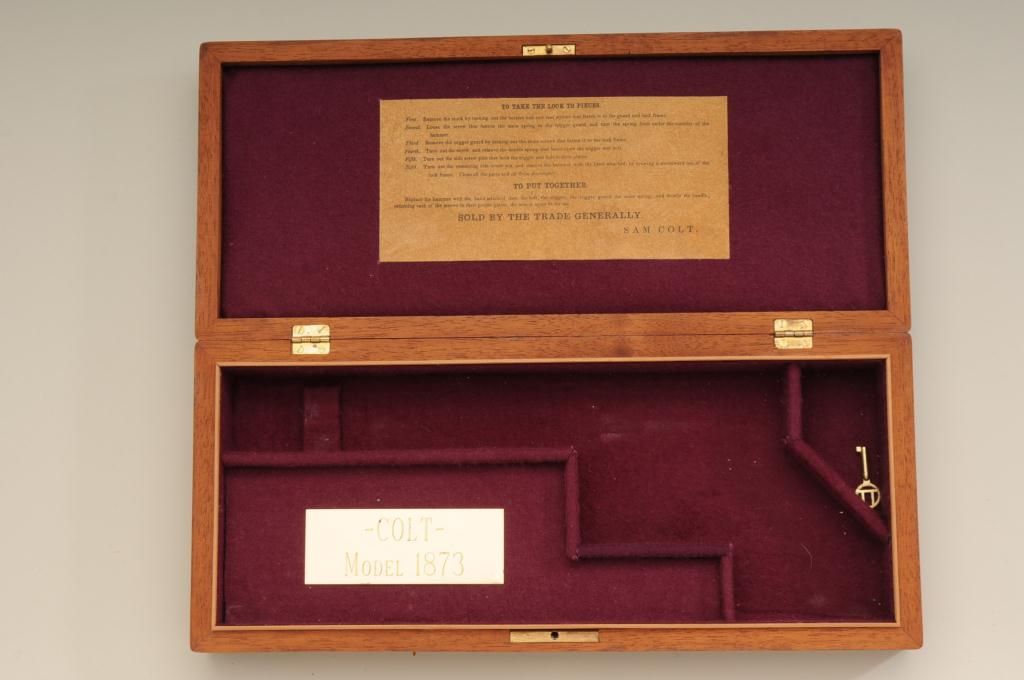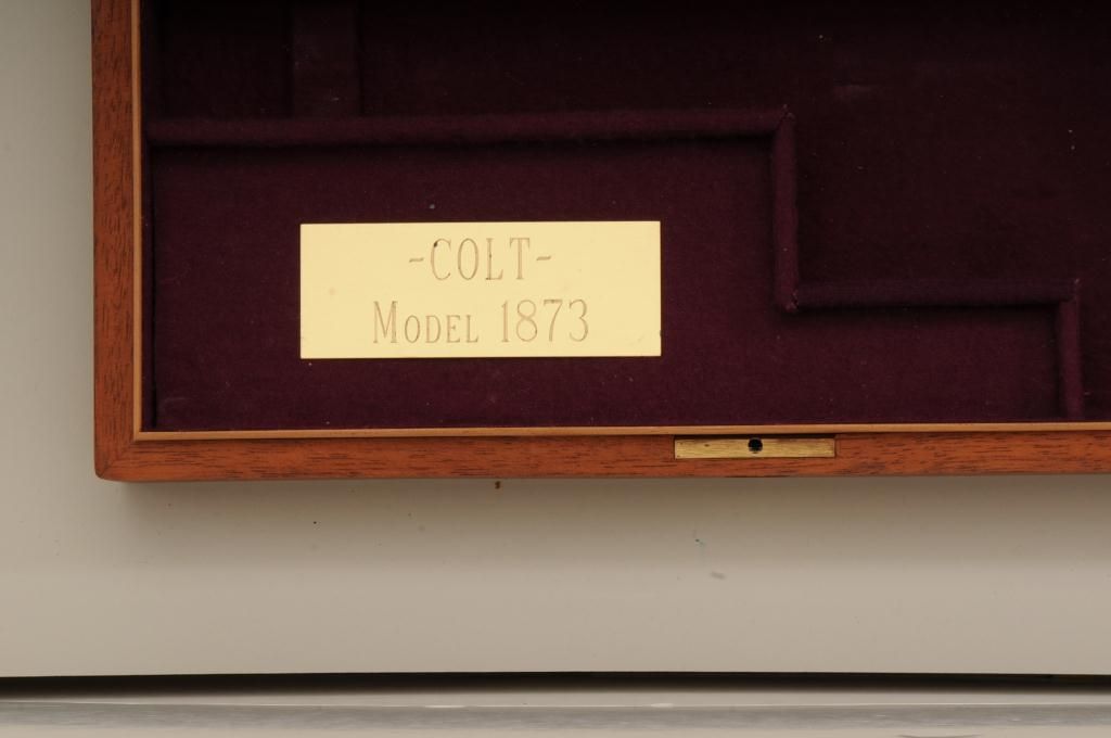 4 well-made boxes for displaying antique Colts. Number 1 fits a model 1873 single action, number 2 also for Colt single action with antiqued interior and aged cartridge block (including brass rod and screwdriver).Number 3 is a very nice modern case for Colt 1860 Army with antiqued style partition lined interior showing label in lid. The box contains an extra high-quality reproduction cylinder of the type made by Weiss in the1950’s to 1960’s, Colt Army mold in fair condition with good cavities and 3 packs of reproduction skin cartridges and 2 cap tins. Number 4 is a Colt factory display case for .22 derringers circa 1960’s in goodcondition. Est.: $300-$600.