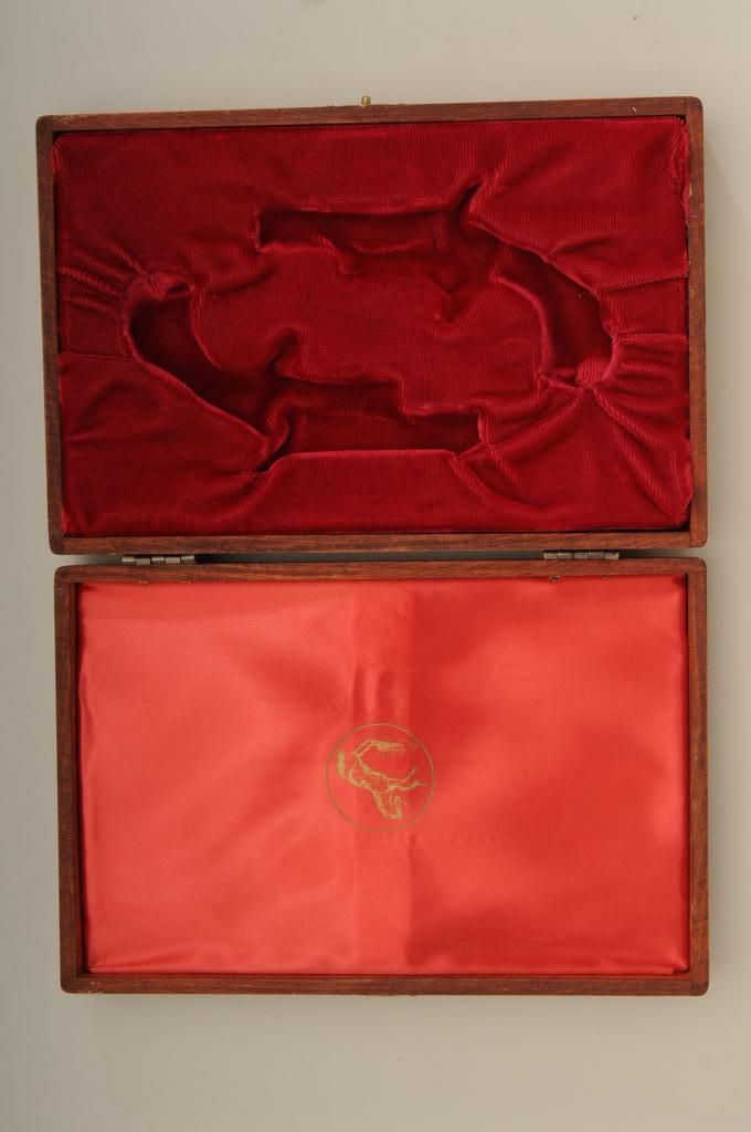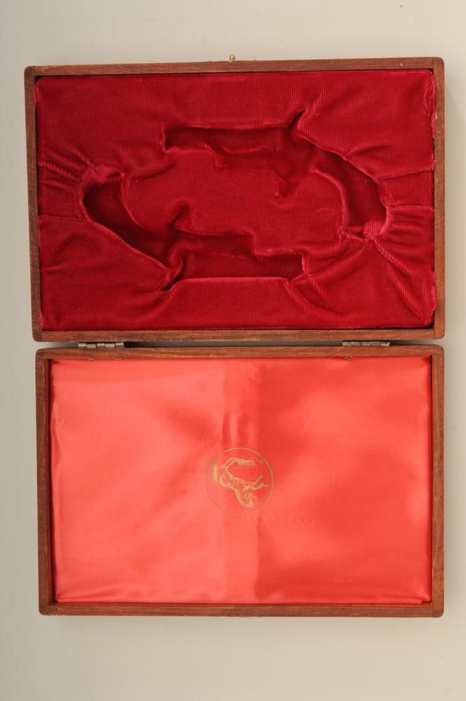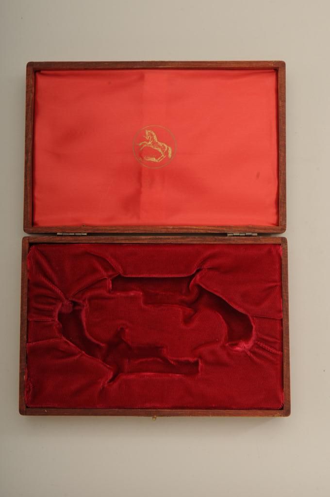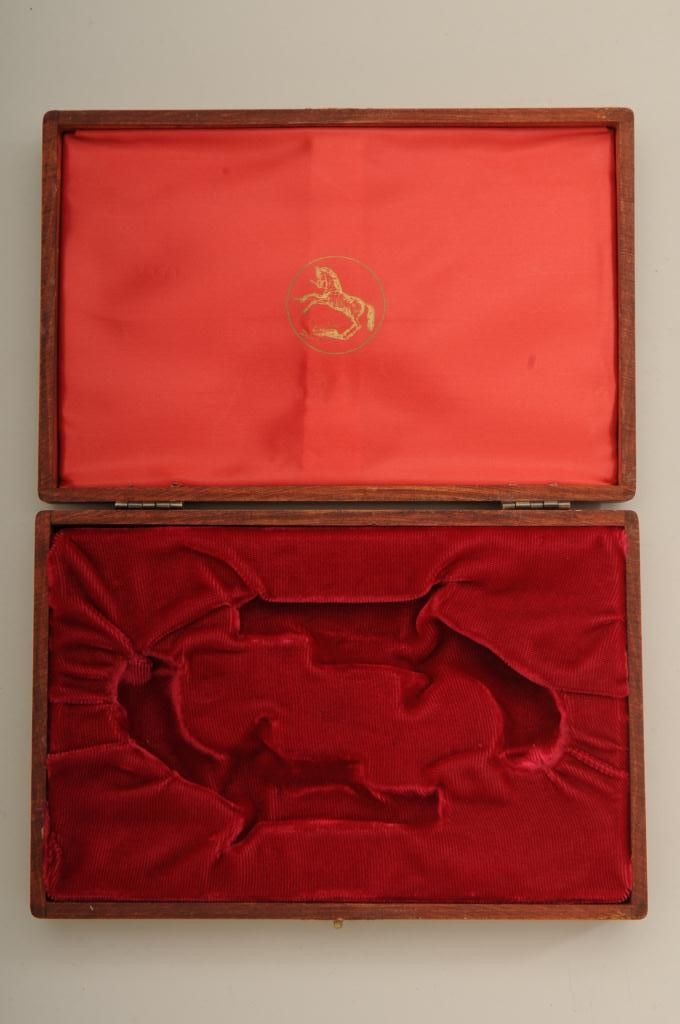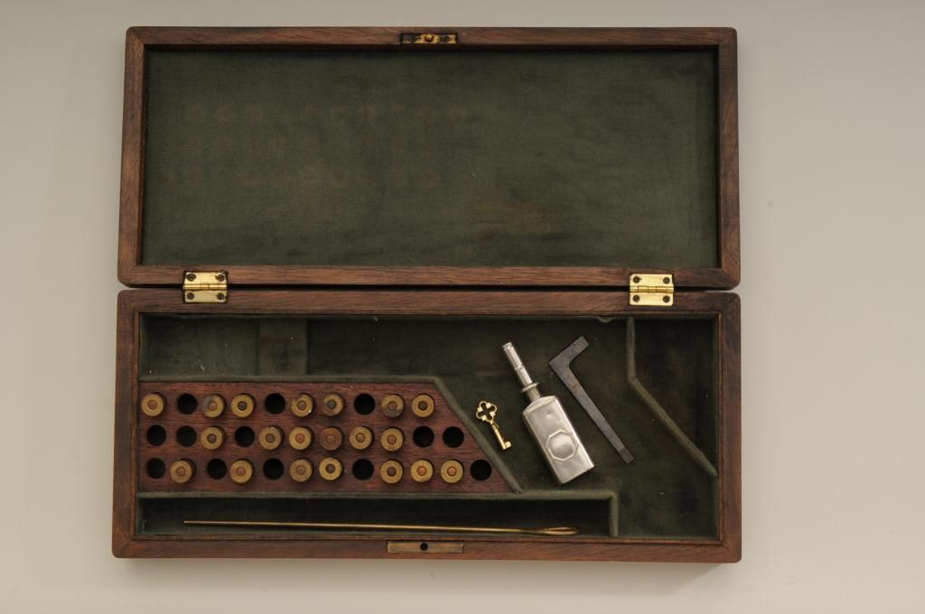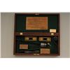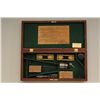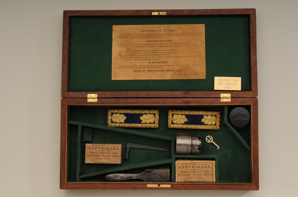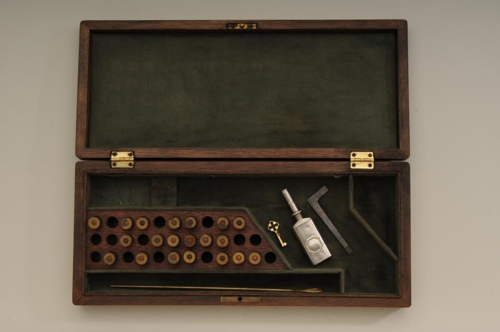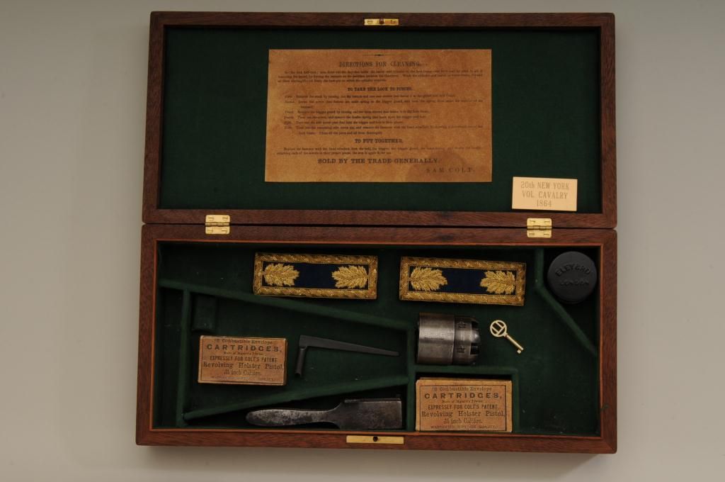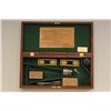 4 well-made boxes for displaying antique Colts. Number 1 fits a model 1873 single action, number 2 also for Colt single action with antiqued interior and aged cartridge block (including brass rod and screwdriver).Number 3 is a very nice modern case for Colt 1860 Army with antiqued style partition lined interior showing label in lid. The box contains an extra high-quality reproduction cylinder of the type made by Weiss in the1950’s to 1960’s, Colt Army mold in fair condition with good cavities and 3 packs of reproduction skin cartridges and 2 cap tins. Number 4 is a Colt factory display case for .22 derringers circa 1960’s in goodcondition. Est.: $300-$600.