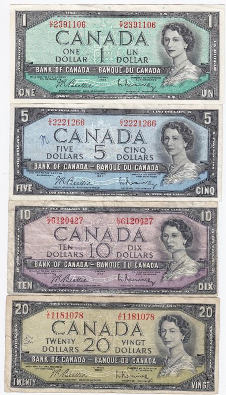 4 x 1954 Canada Bank Of Canada Notes, $1, $5, $10, $20